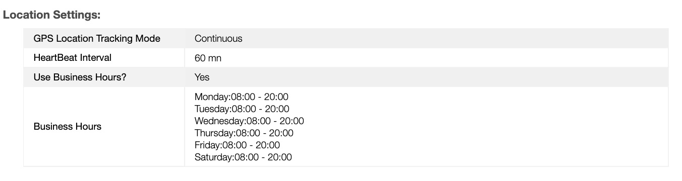 The "Location Settings" is the third section of the "Summary" tab. It contains the location tracking information, the business hours, and more.