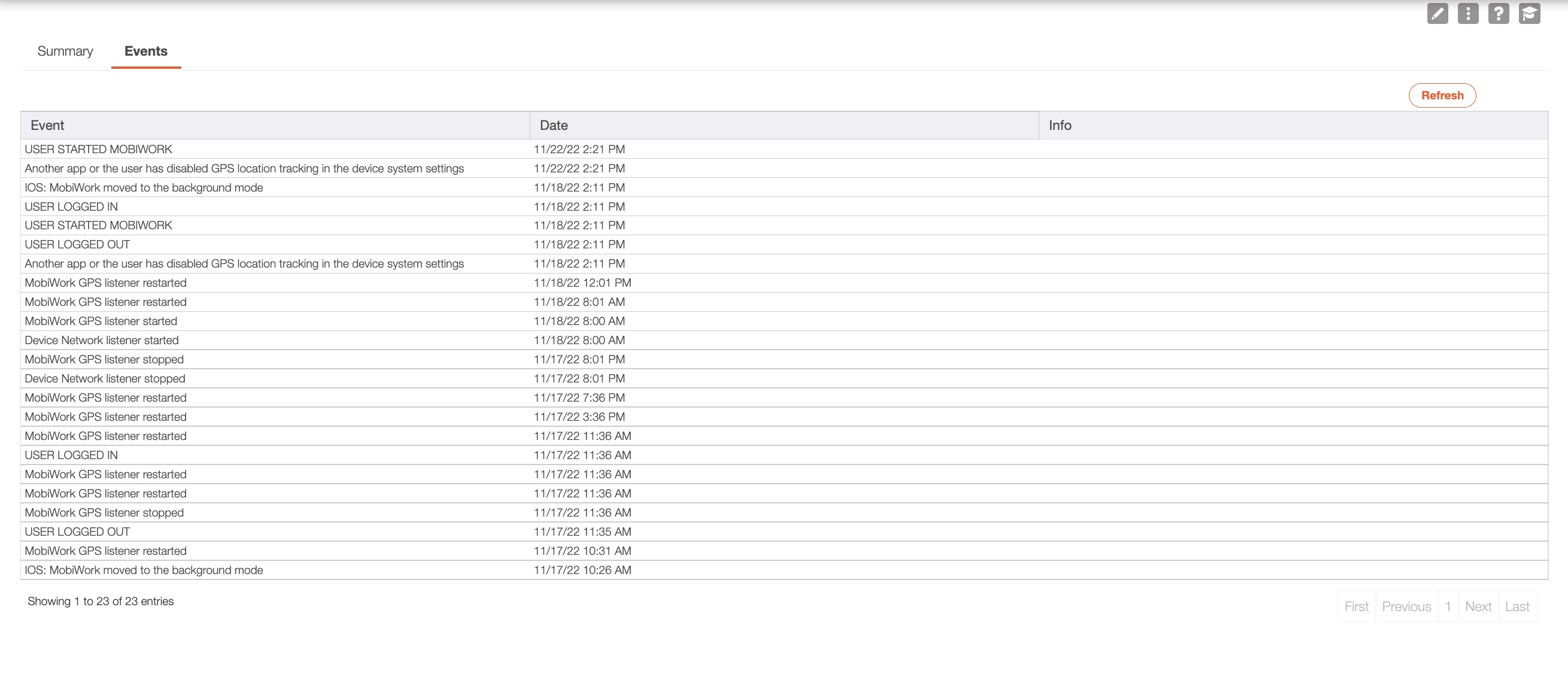 The "Events" tab will display all the historical information regarding the device (e.g., login information, when the GPS starts/restarts/stops, etc.).