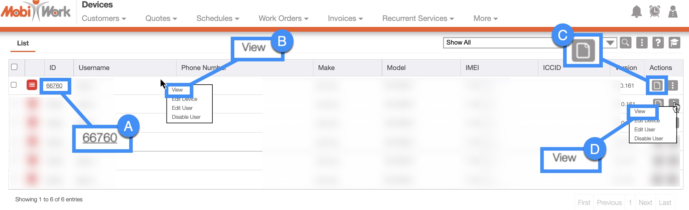 Once you are on the "List" tab, there are four different ways to access the View Device page: