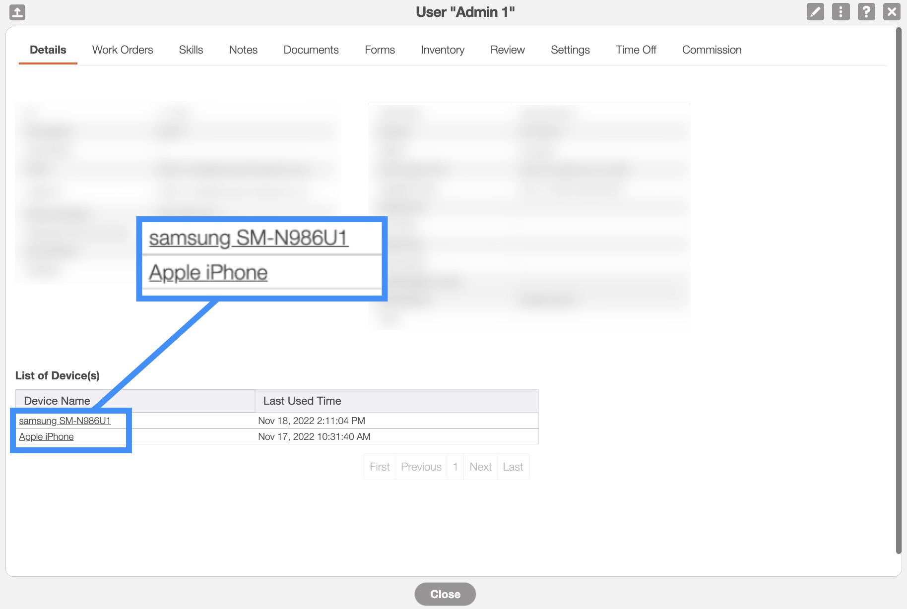 On the View User "Details" tab, you will be able to access the View Device page by clicking on the desired device underneath the "List of Device(s)" column: