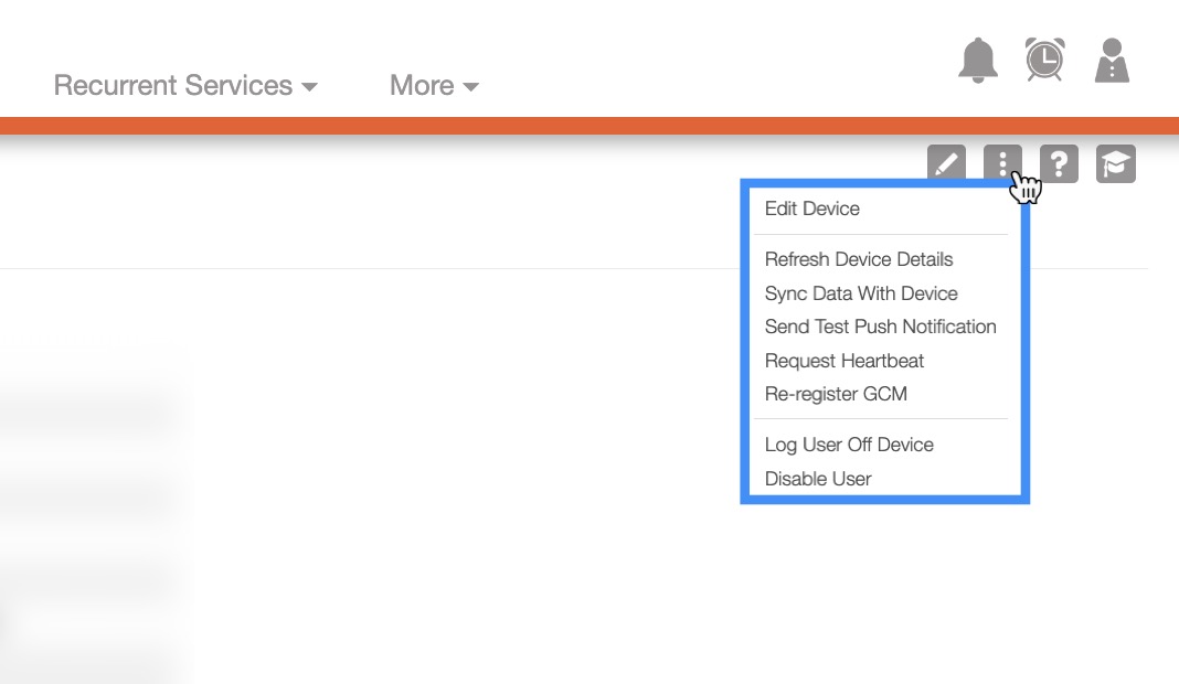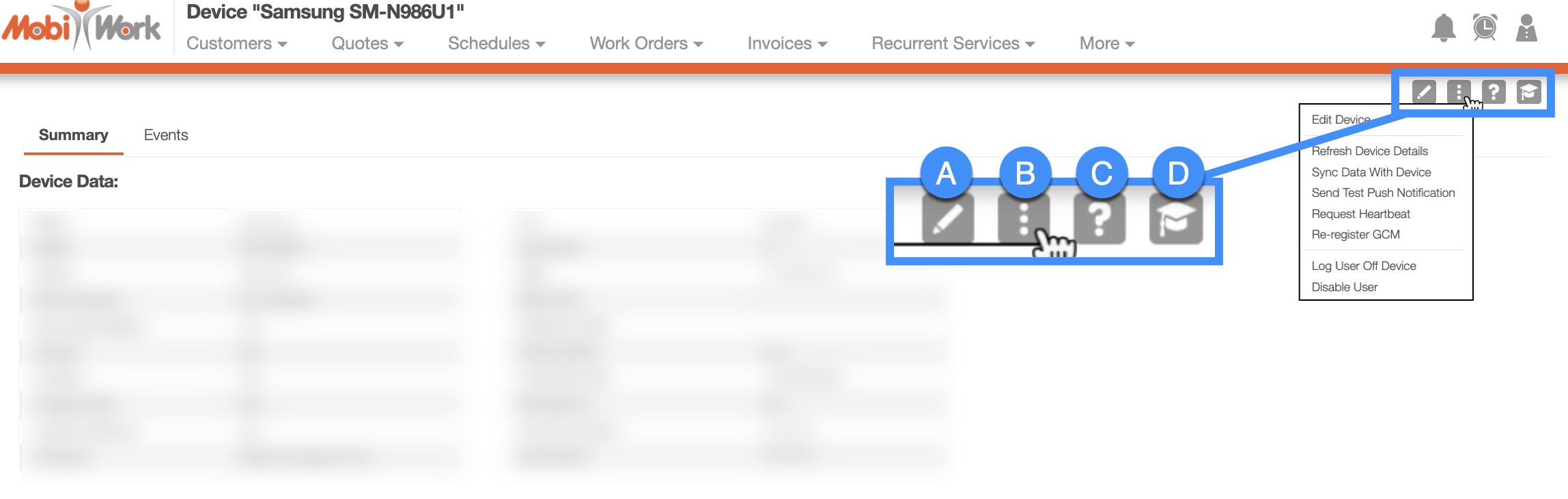 In the upper right corner of the View Device page there will be four buttons that will allow you to perform additional actions on the device:
