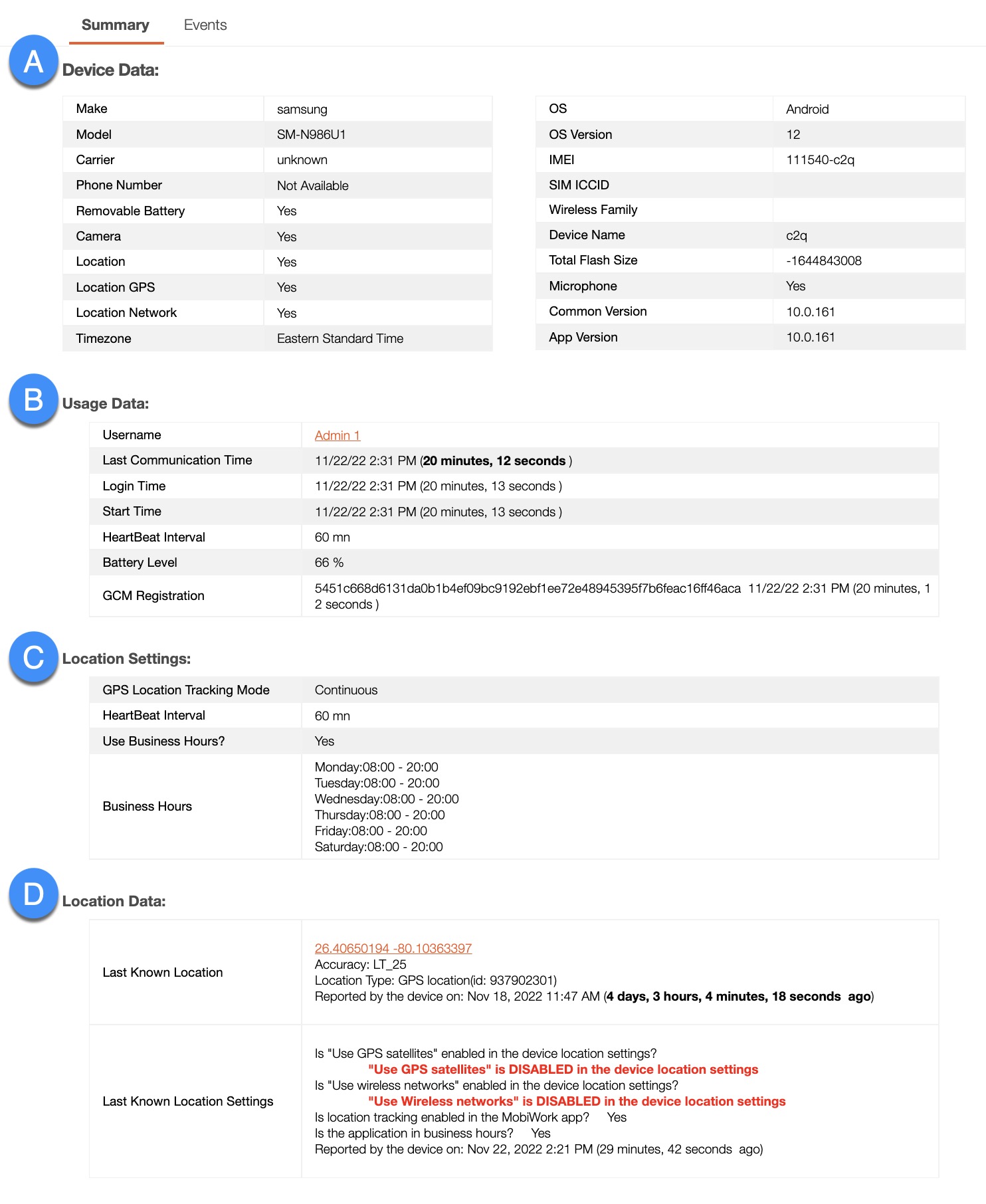 | "GPS Location Tracking Mode" | Illustrates the GPS tracking of the device (i.e., continuous, no location tracking, frequency mode [at defined intervals], or on demand [on the device, the user can specify when they want to be tracked]). |