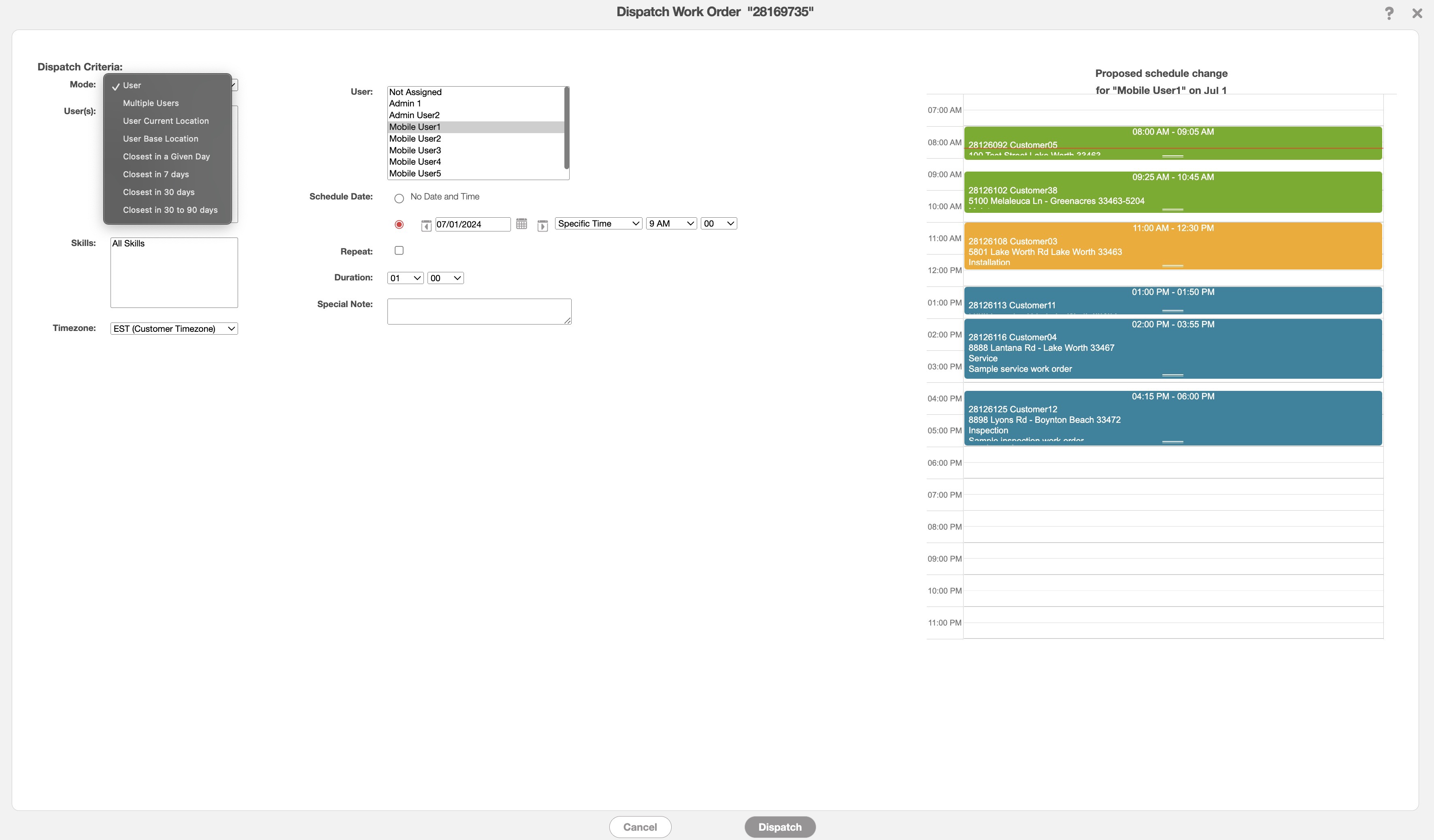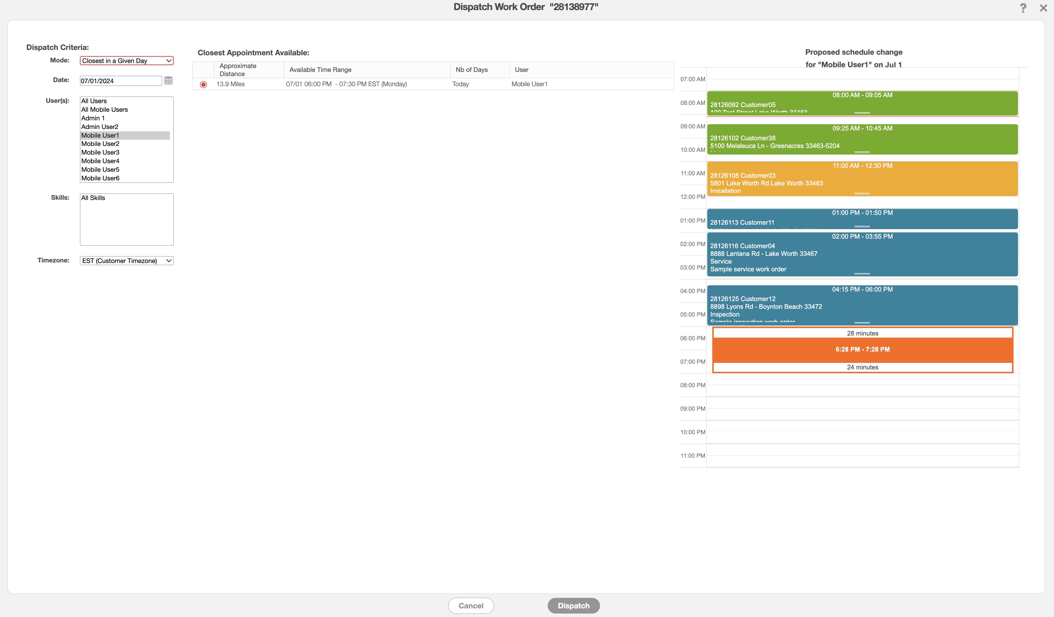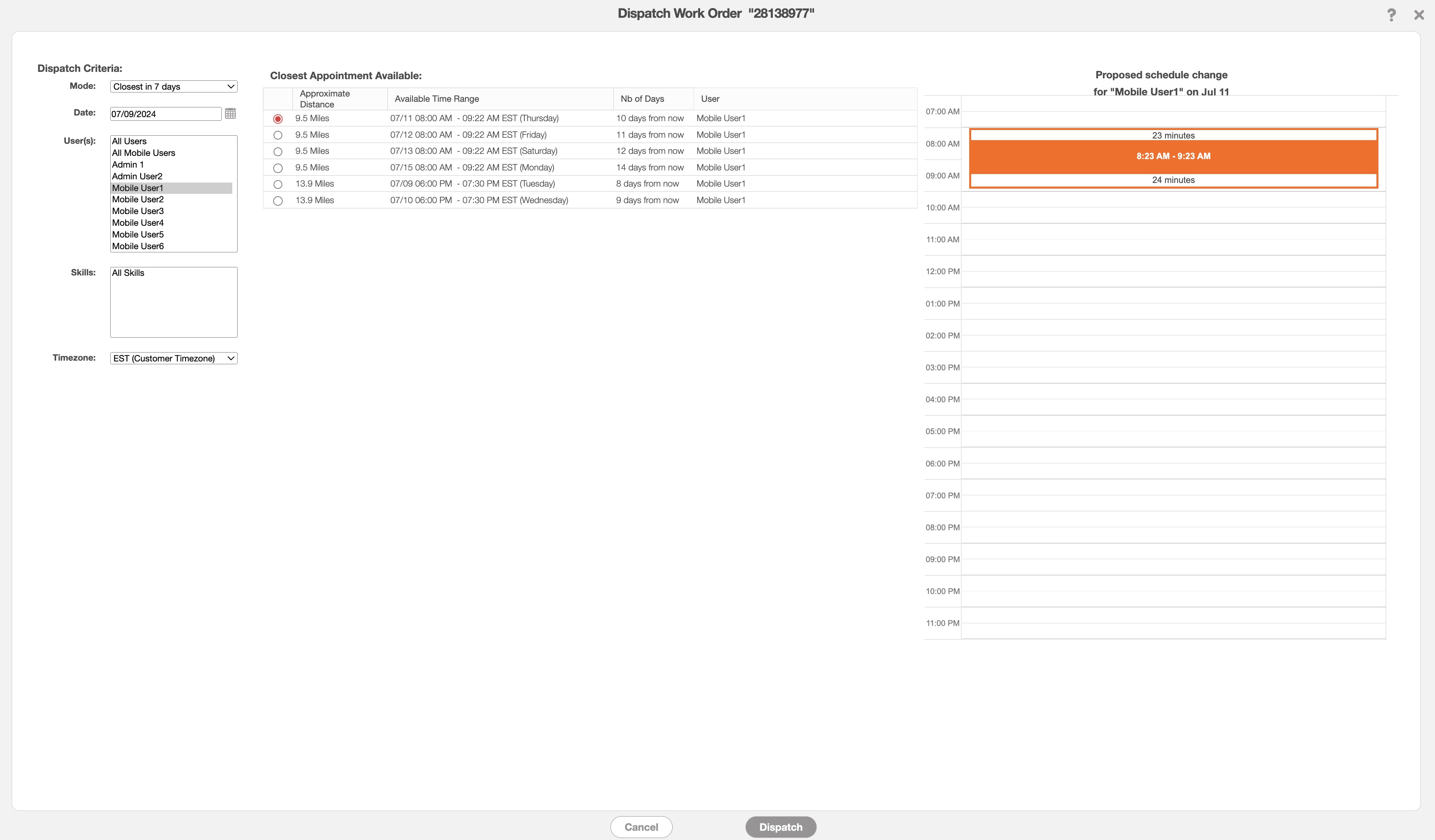 The "Closest in 7 Days" mode will allow you to view the schedule of all your users within the next seven days. You can then dispatch the user closest to the work order location within that time frame:
