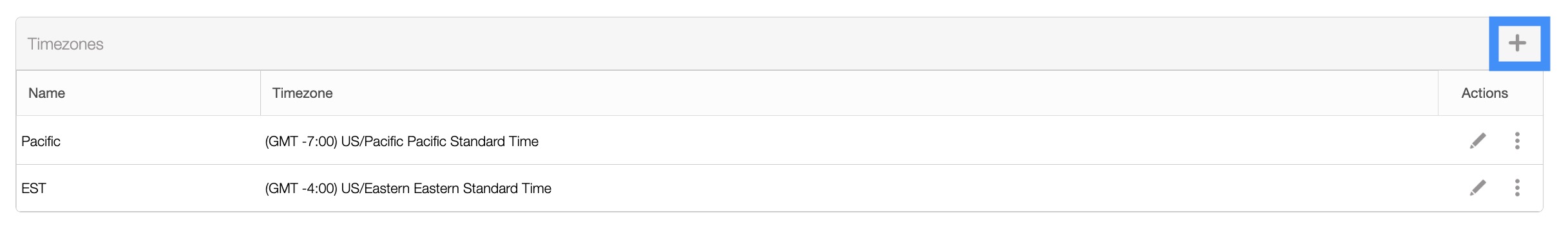 The Add Time Zone pop-up window will appear. Enter the name you would like to refer to this time zone (e.g., Default, EST, Pacific, etc.), and select the desired time zone from the drop-down menu. Once you are satisfied with the information entered, click the Add button: