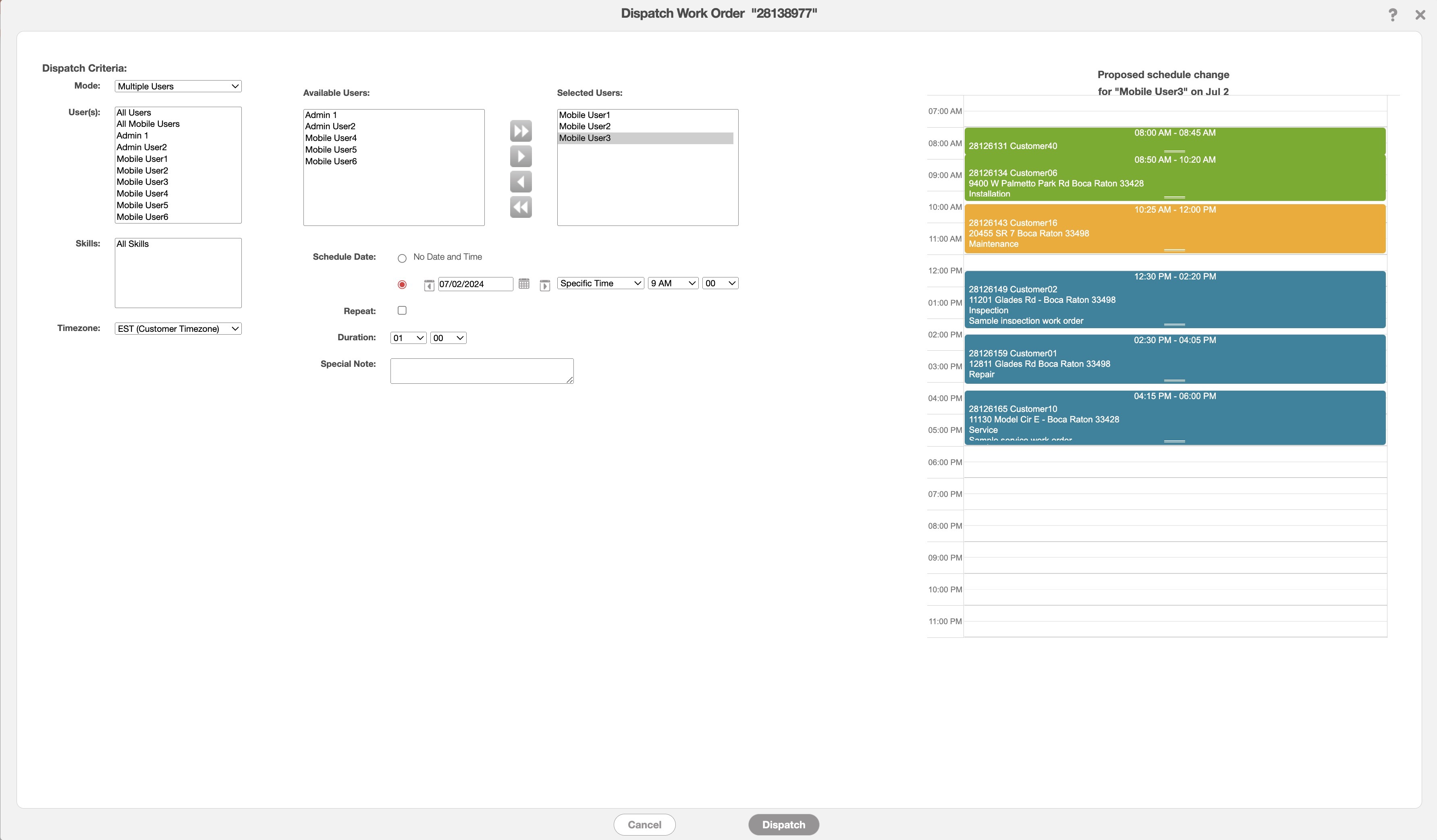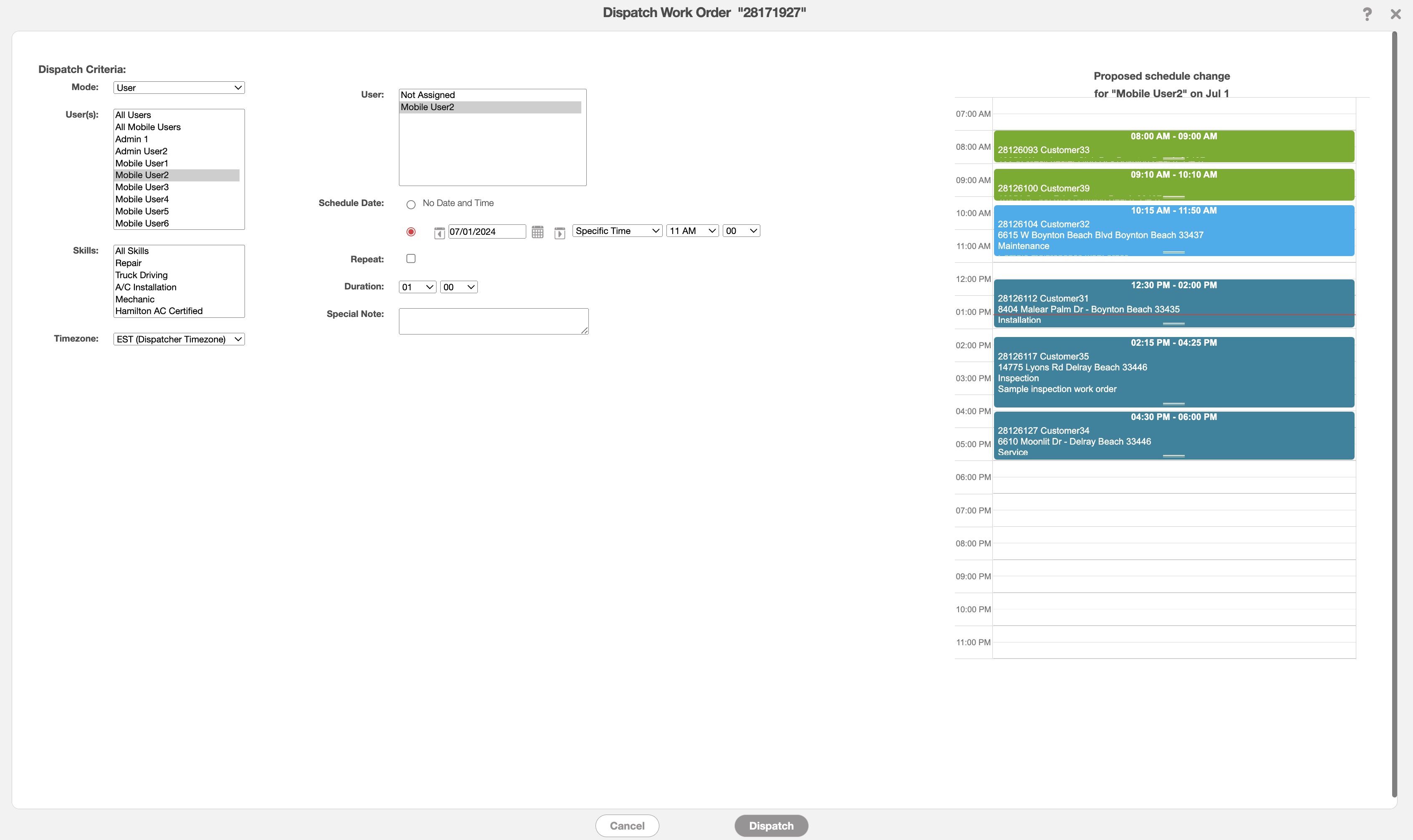 To view different time zones in the Dispatch Work Order pop-up window, your customer's address must be in a different time zone than your user.