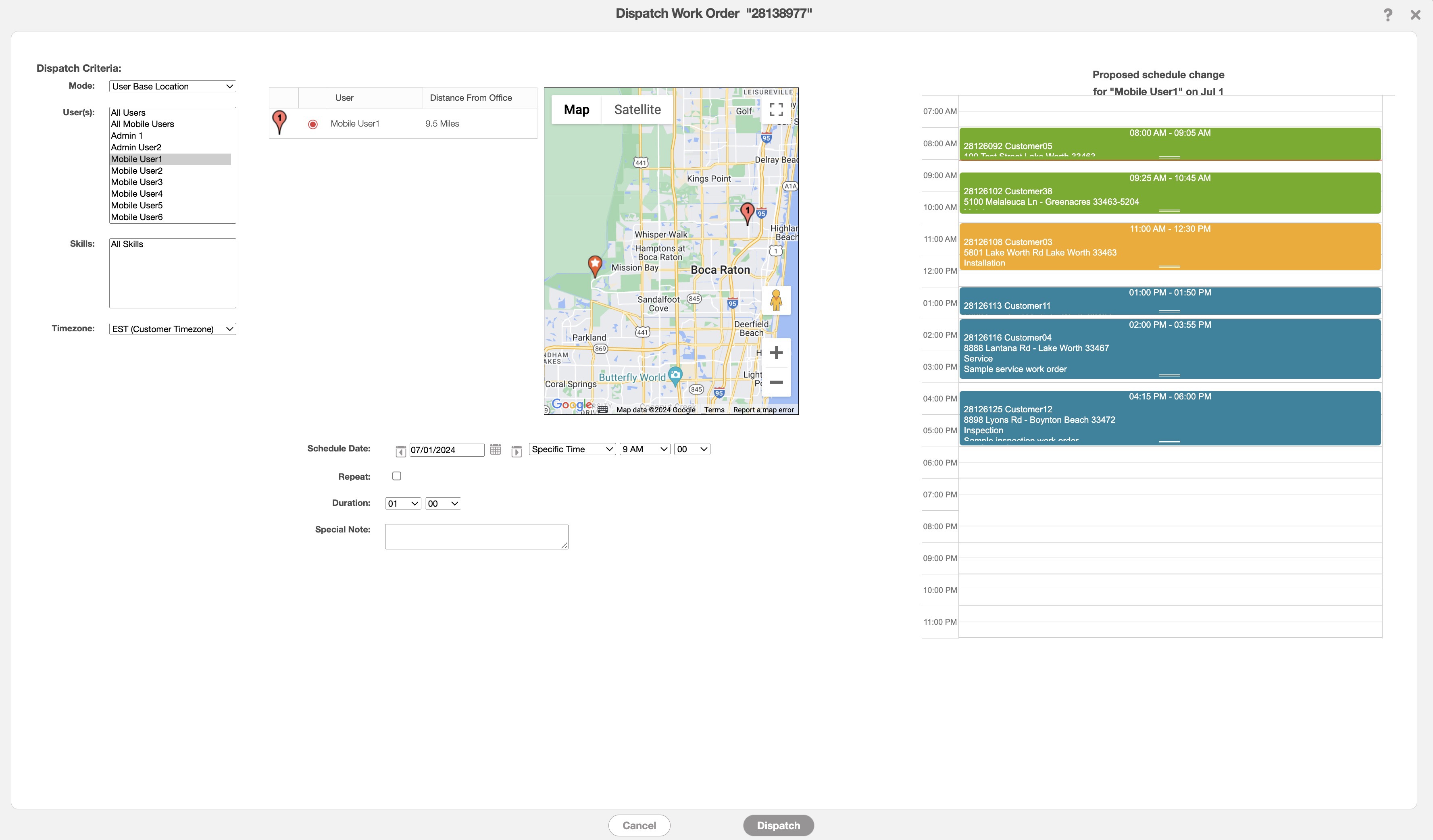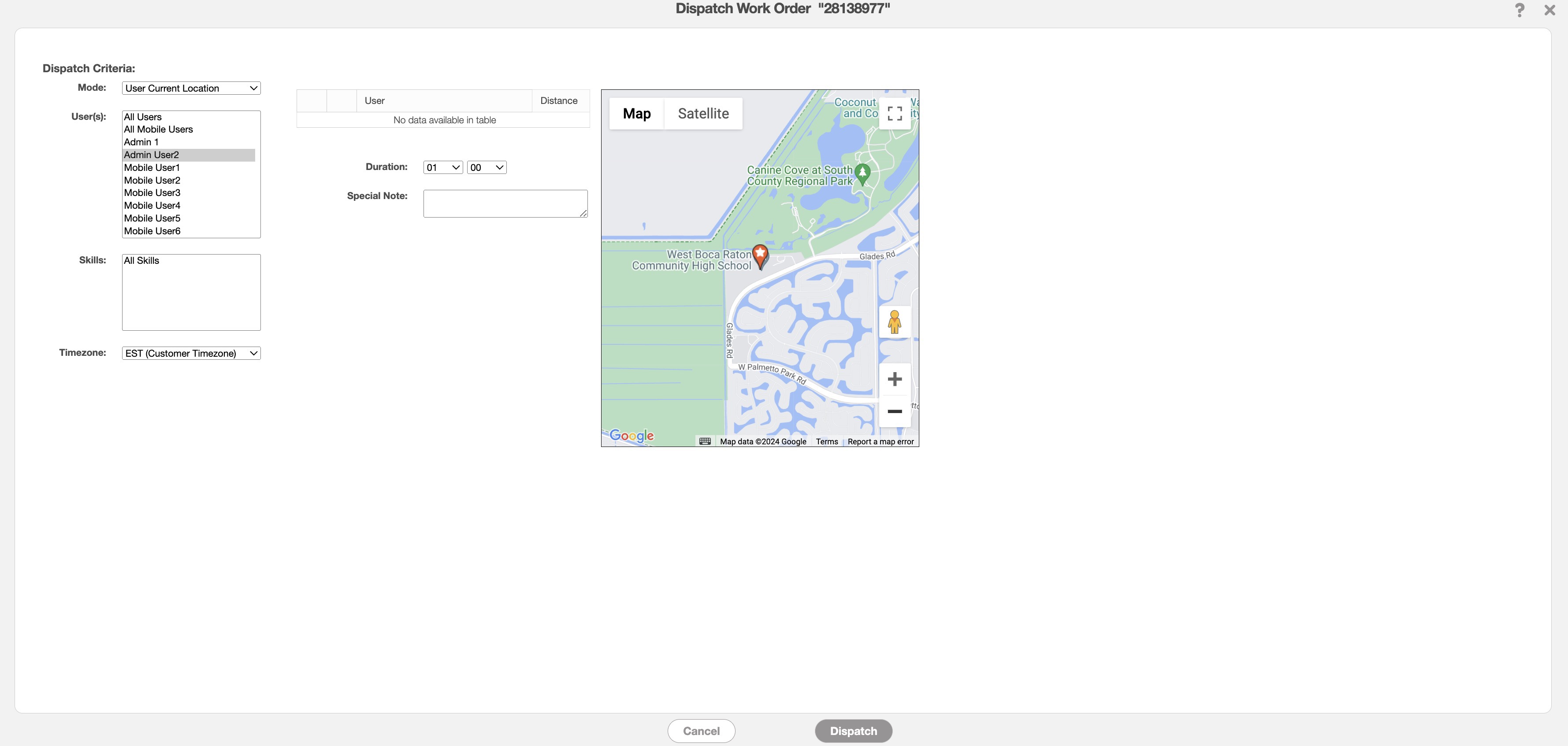 Once you select the closest user to the work order location and input the rest of the dispatch data click the Dispatch button.