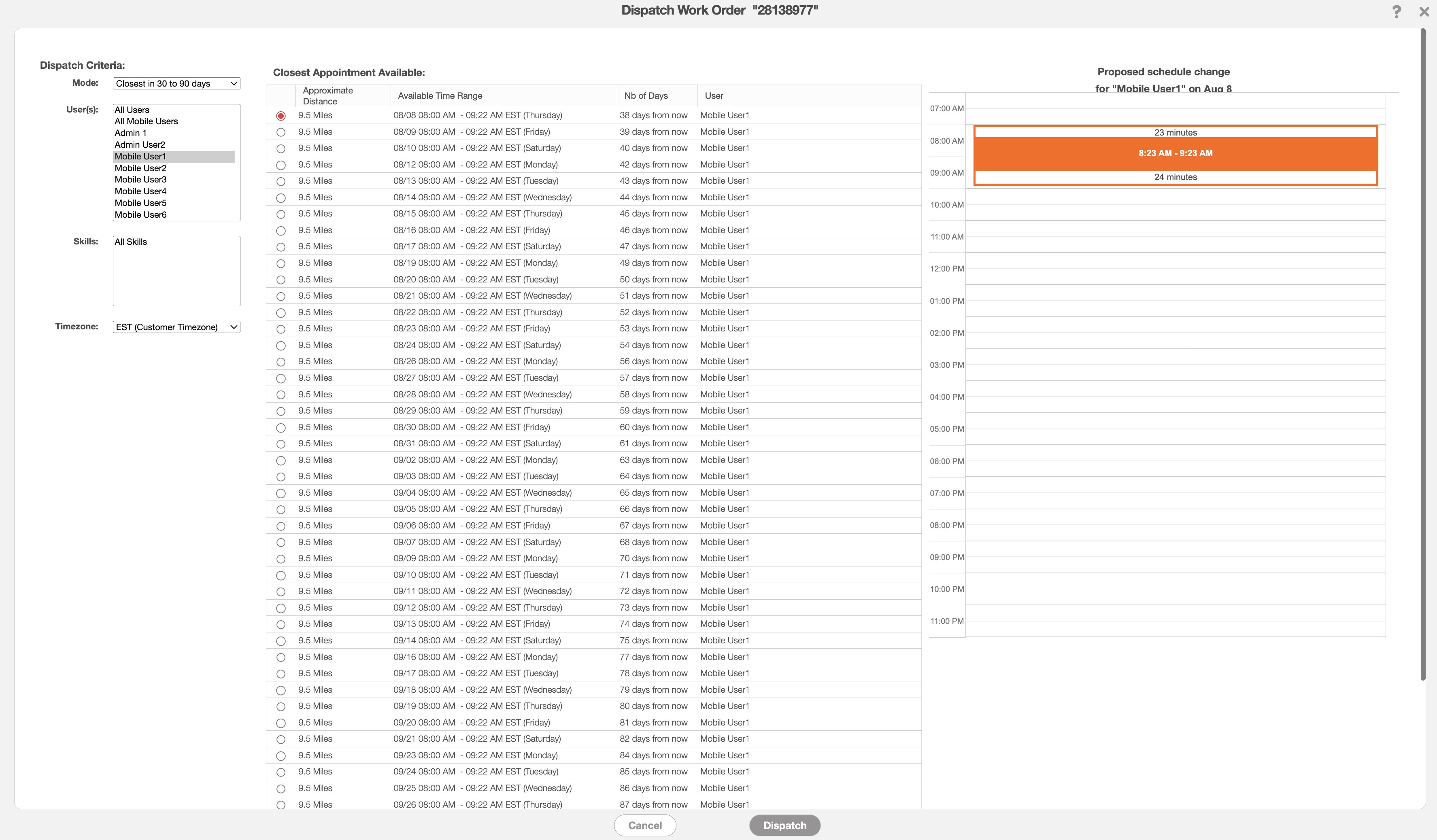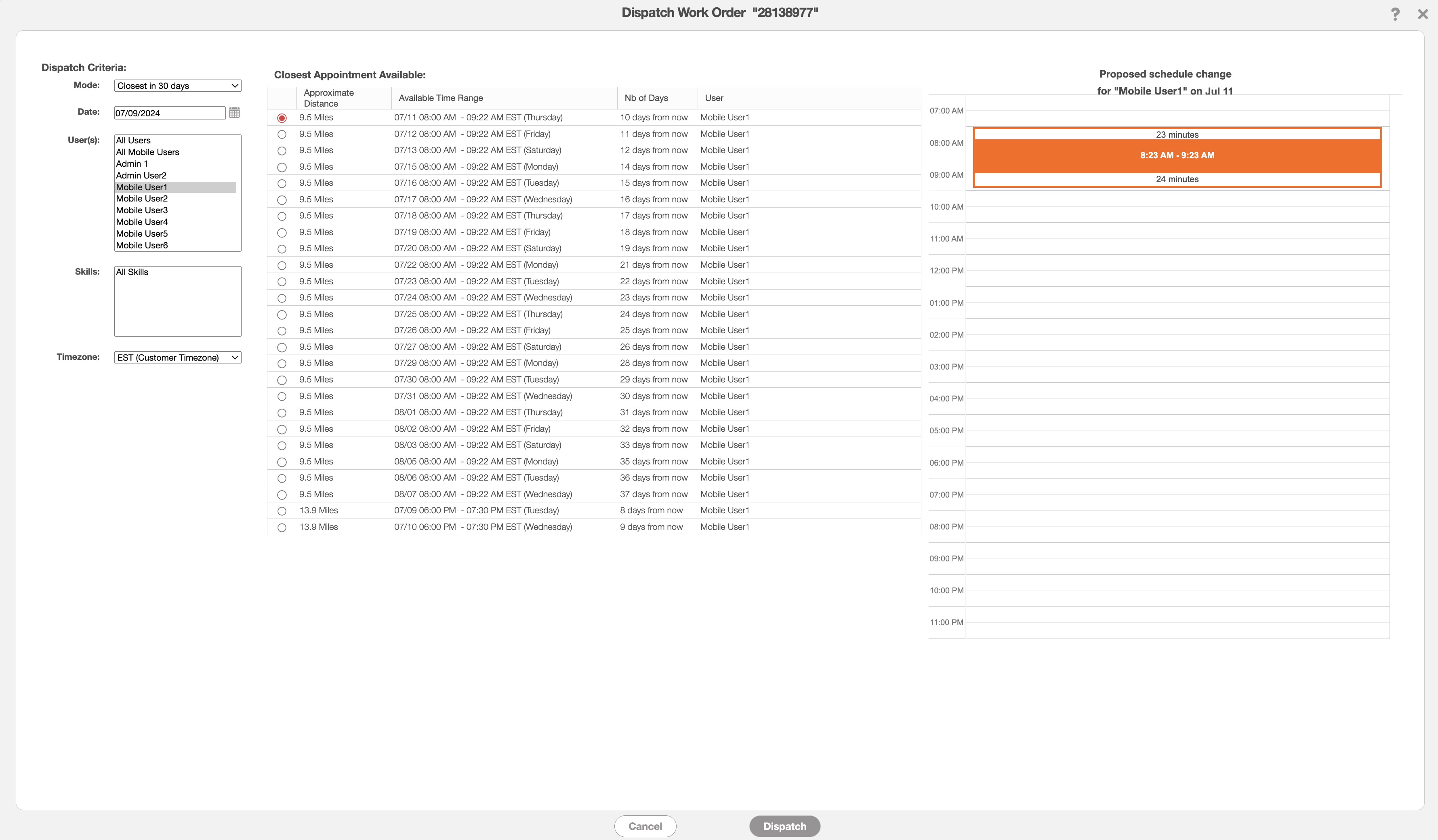 The "Closest in 30 Days" mode will allow you to view the schedule of all your users within the next thirty days. You can then dispatch the user closest to the work order location within that time frame: