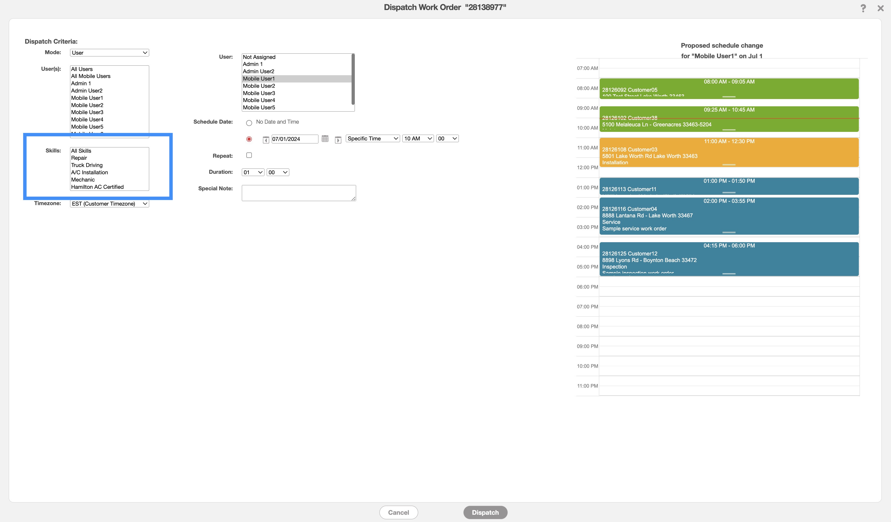 Once you have selected the user with the desired skill set, click on the Dispatch button to finalize. When work orders are dispatched by skill, MobiWork will display technicians with at least one matching skill from the list, even if they have multiple skills associated with their profile.