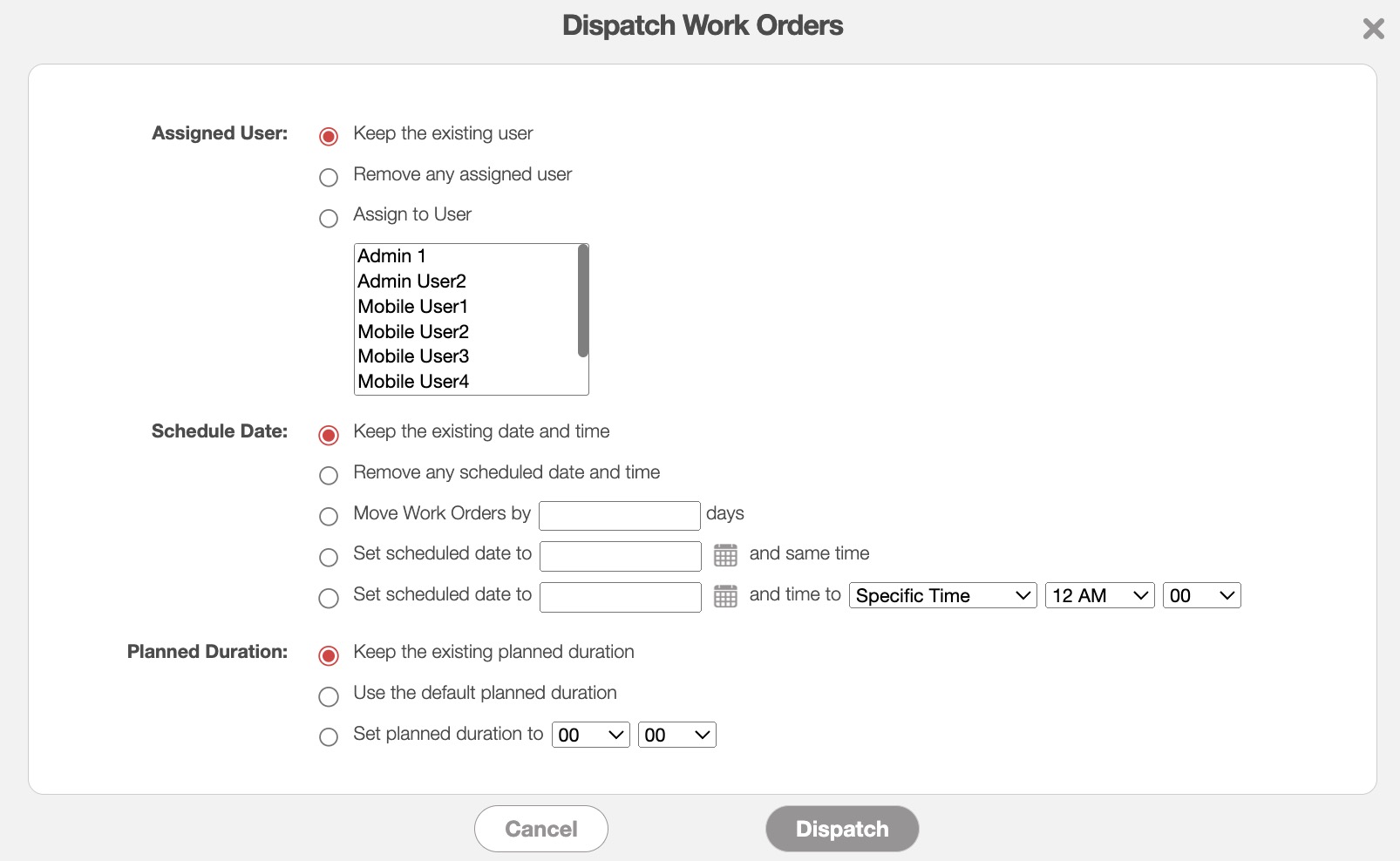 Once you have selected the new user you want and are satisfied with your changes to the work order click on the Dispatch button: