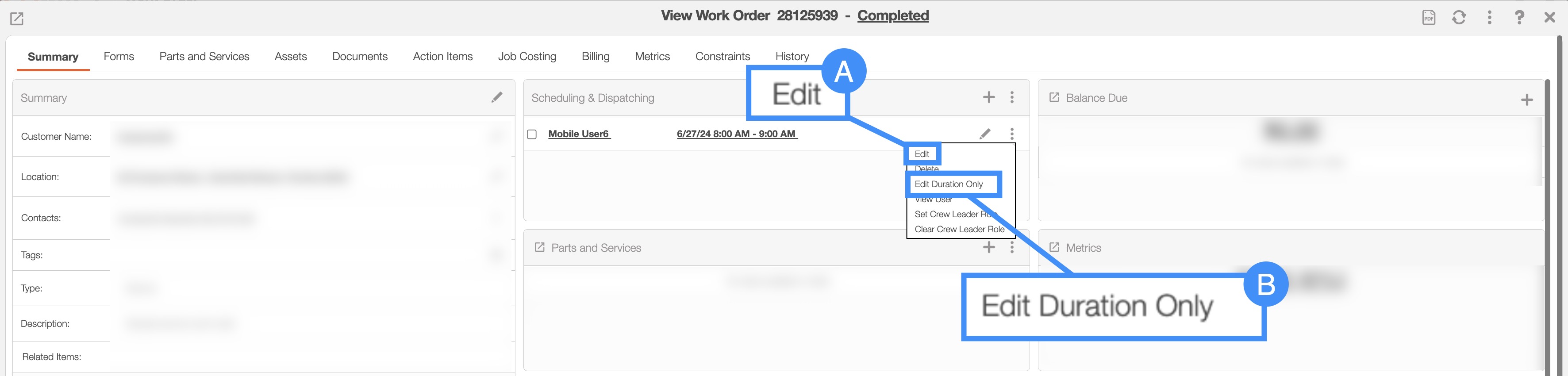 Or the "Edit Duration Only" option to update the planned time spent on the work order: