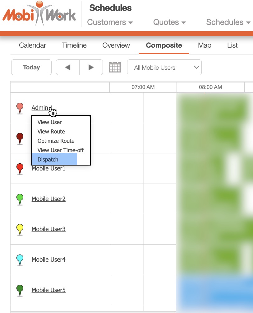 - In the Schedule feature, on the "Timeline" or "Composite" tabs, you can select a user and choose the "Dispatch" option from the drop-down menu: