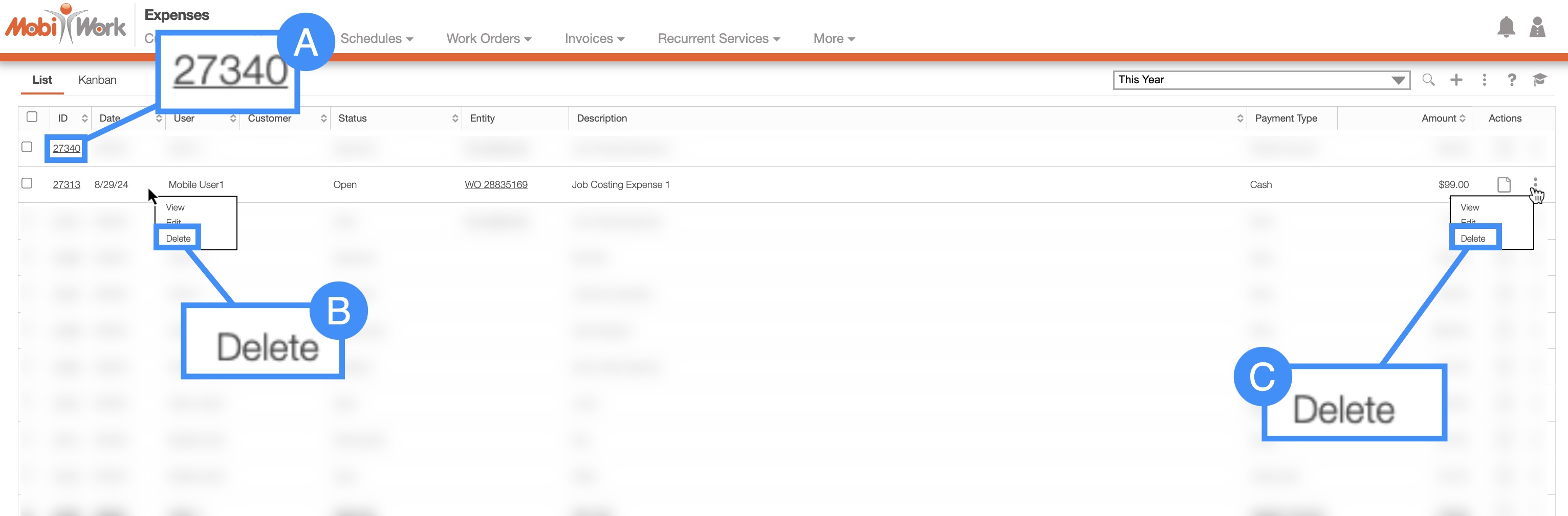 To delete an expense, you will first need to be on the Expenses feature tab on MobiWork; for more information on how to access this page, please see the Expenses List section.