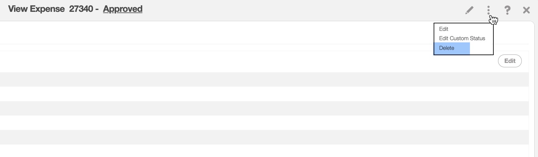 - In the upper right-corner of the View Expense pop-up window, you will see the Individual Actions button. You can delete the expense by selecting the "Delete" option: