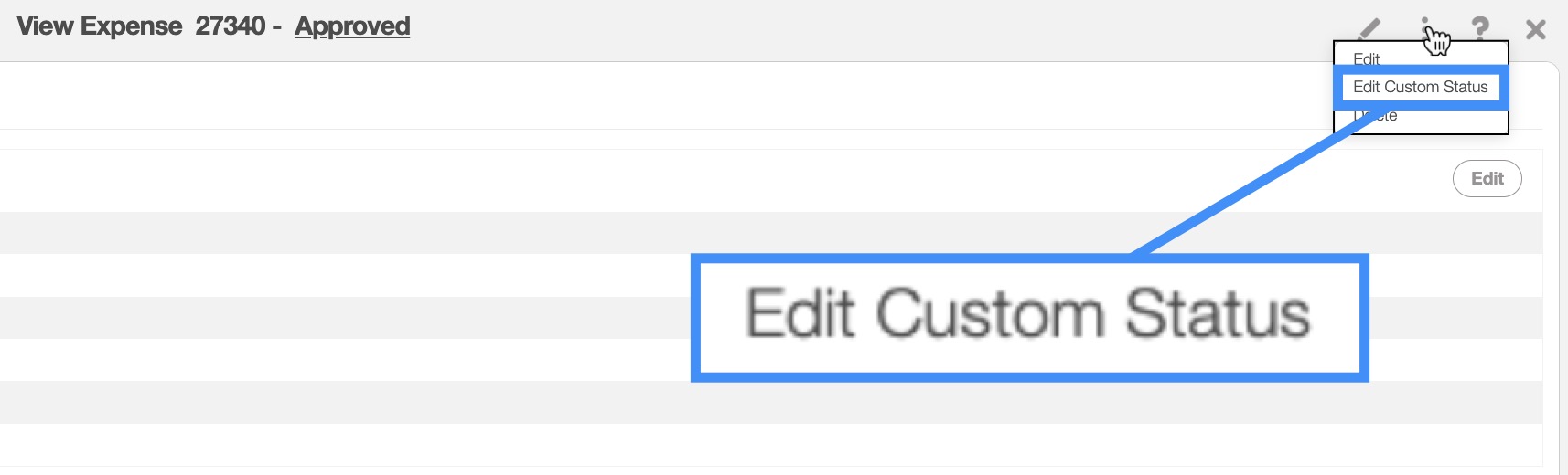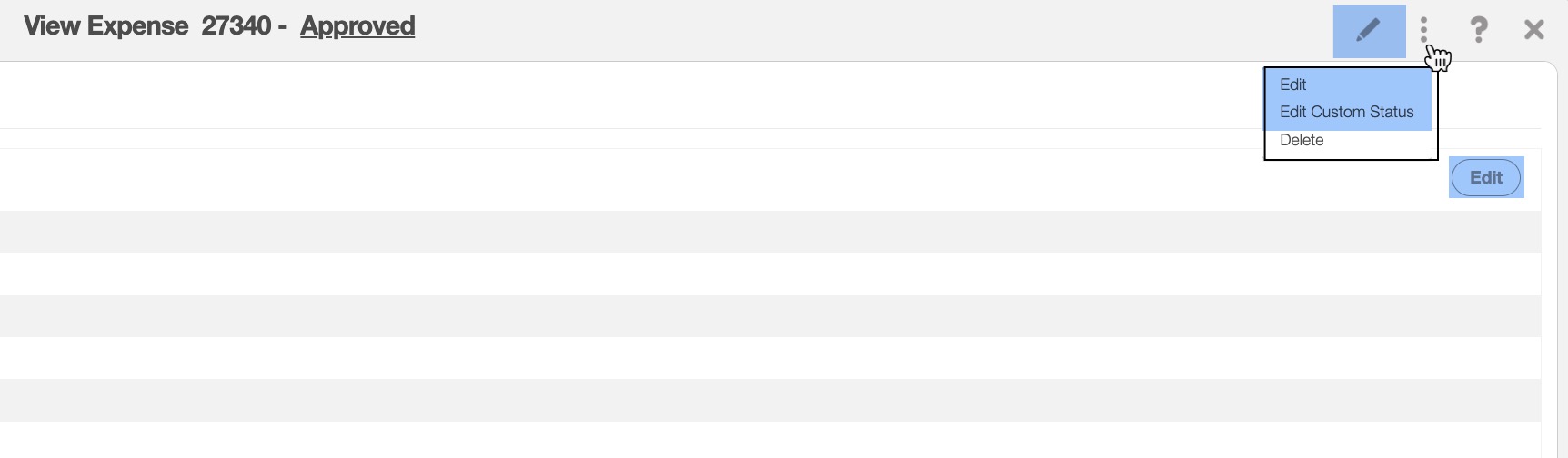 - In the upper right-corner of the View Expense pop-up window, you will see a Pencil icon and the Individual Actions button. Either option will allow you to edit the expense. The Edit button below these actions will also allow you to edit the expense. You can edit the custom status by selecting the "Edit Custom Status" option from the Individual Actions drop-down: