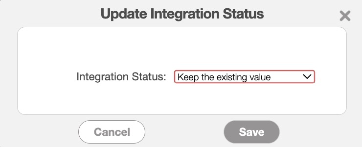 The Update Integration Status pop-up window will then appear. In this pop-up window, select the desired integration status from the drop-down and then click the Save button: