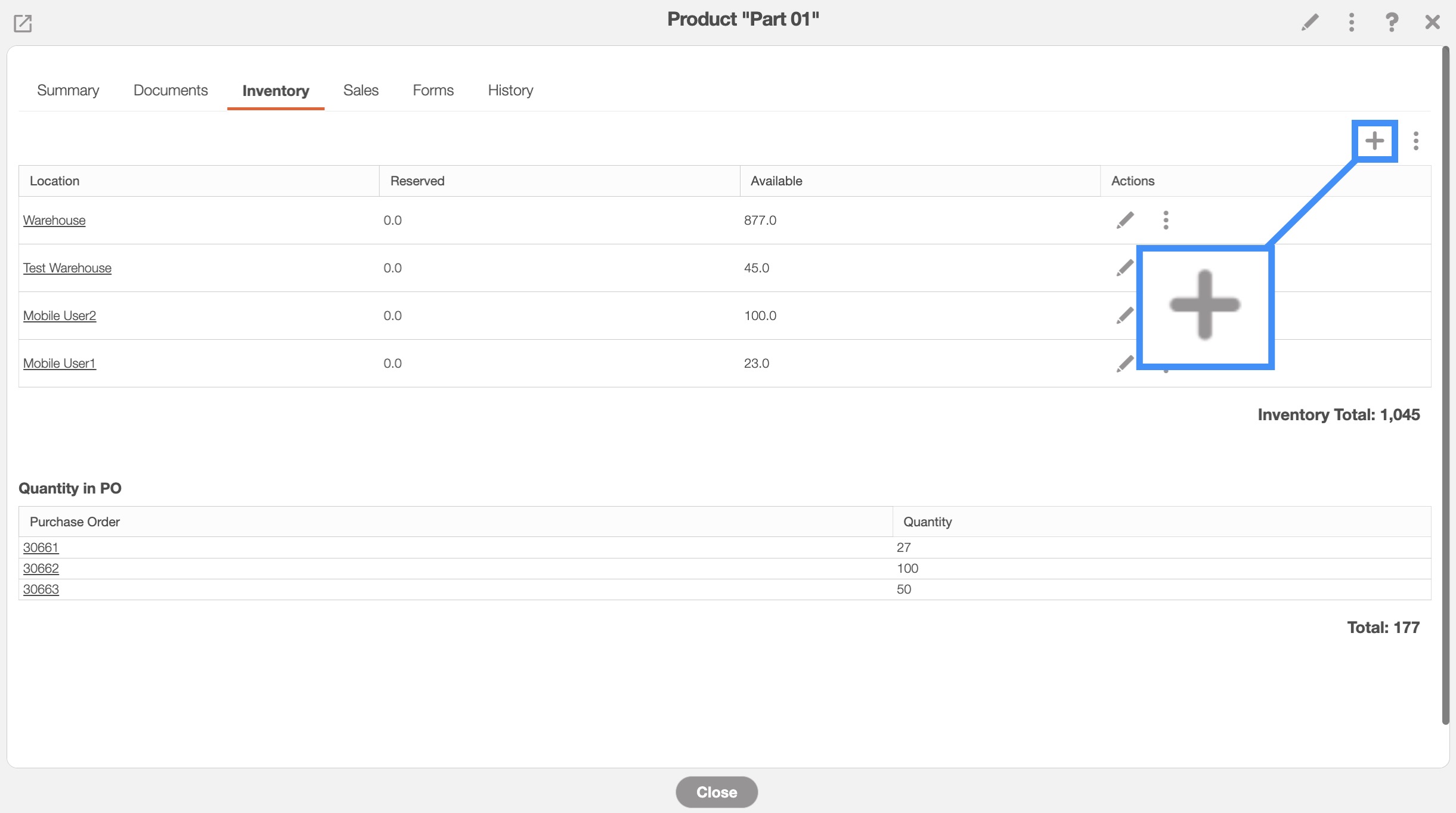 There are several different ways to transfer stock between warehouses or users. You can transfer stock from the specified View Part pop-up window or through Inventory tabs: