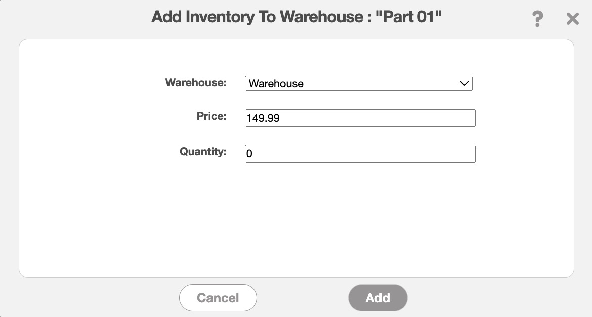 Once you are satisfied with the information entered, click on the Add button to confirm that addition of the parts or products into the specified warehouse.
