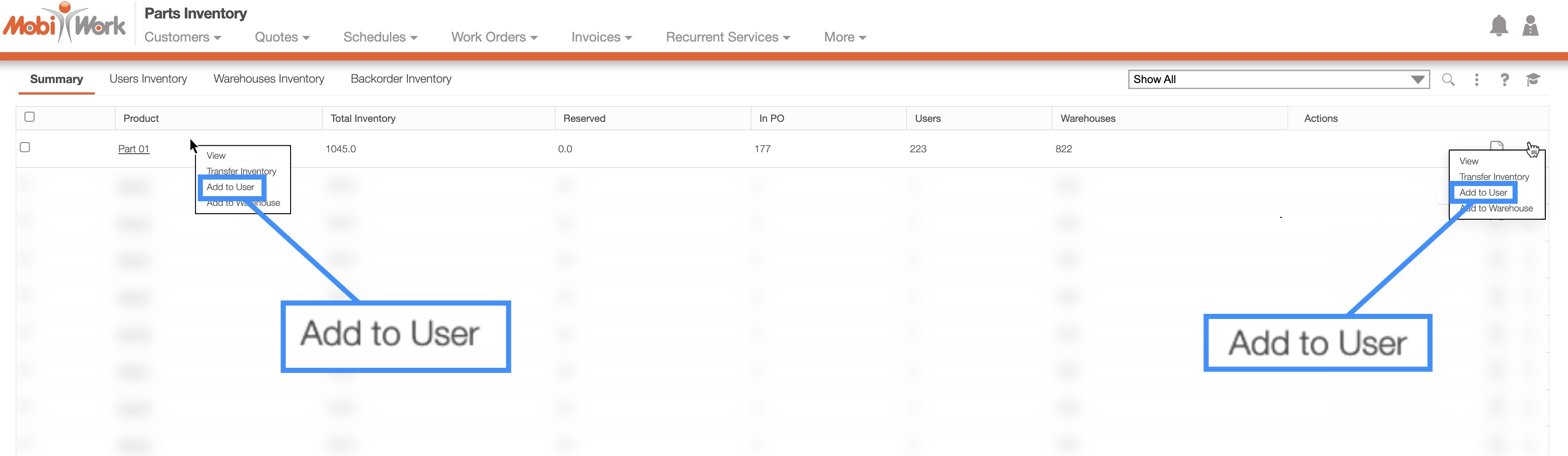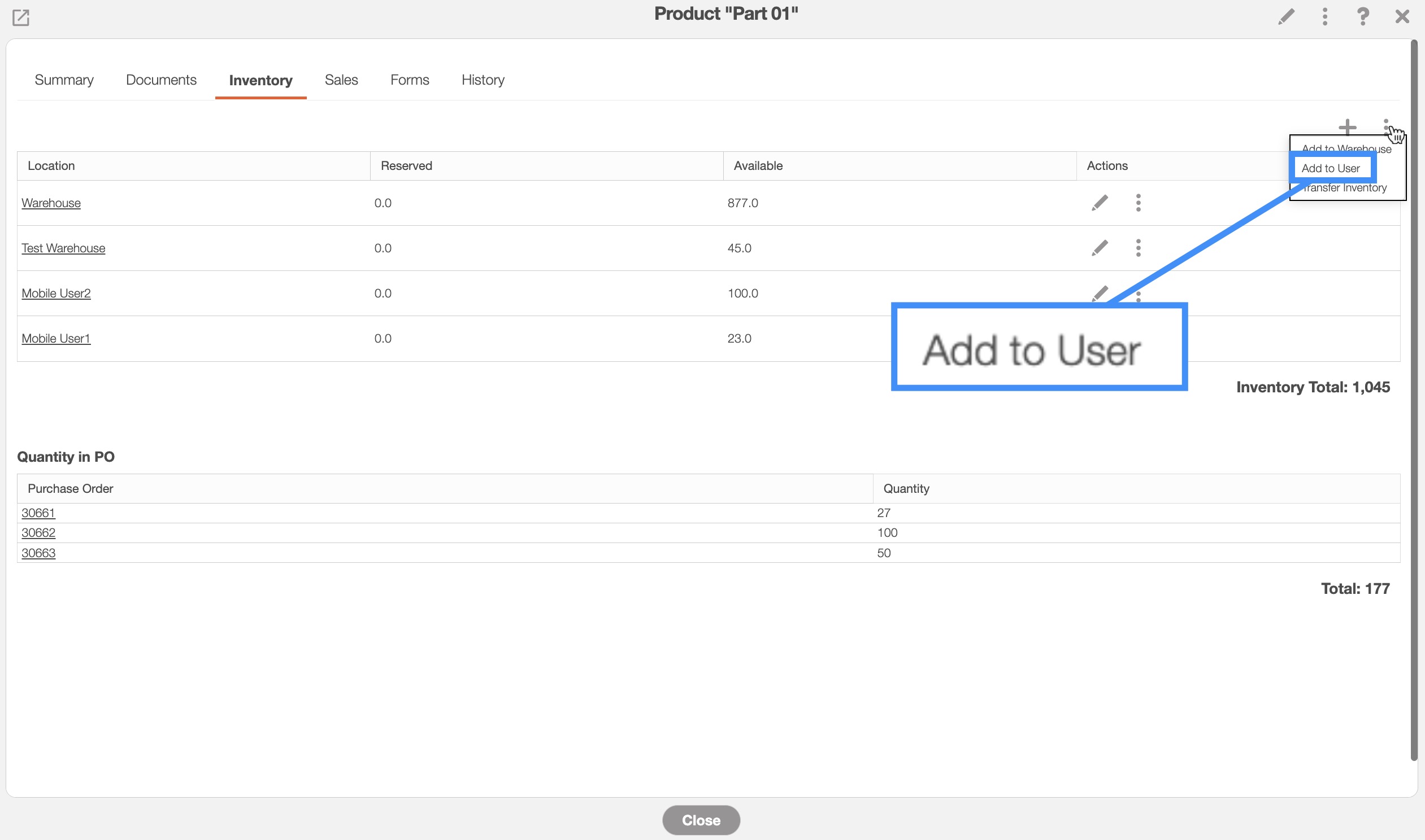 You will also be able to add inventory to a user from the Inventory "Summary," "Users Inventory," and "Warehouses Inventory" tabs.