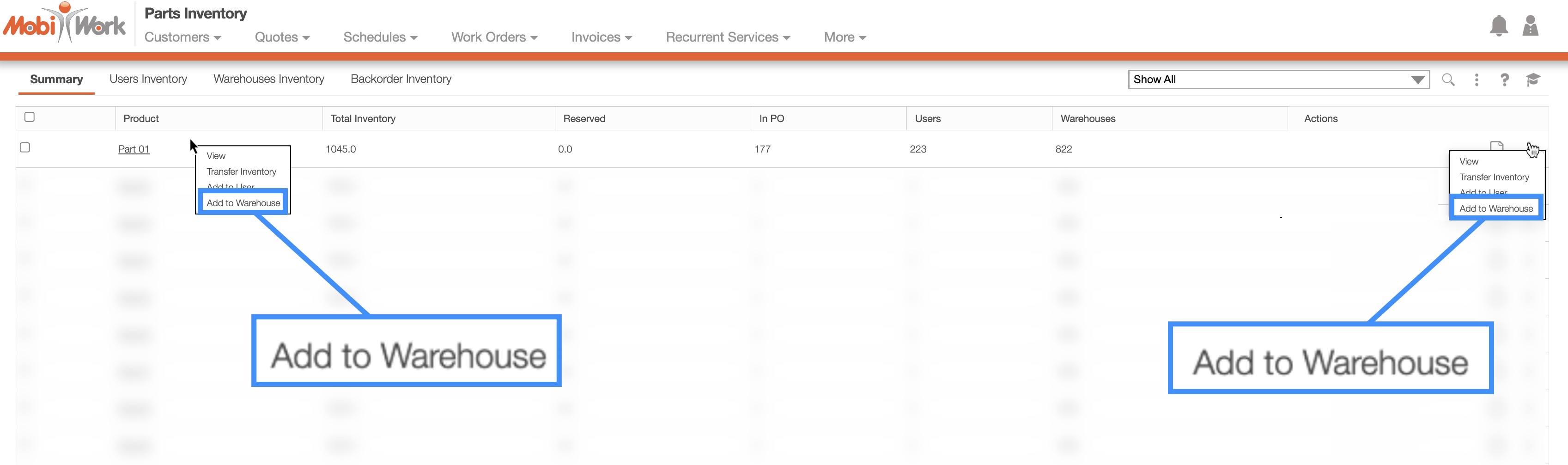 You can either right-click on the desired part or click on the Individual Actions button and from the drop-down select the "Add to Warehouse" option: