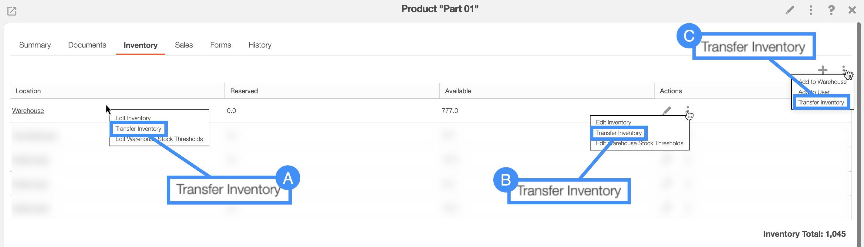 Once you are on the "Inventory" tab, you can transfer inventory through the following actions: