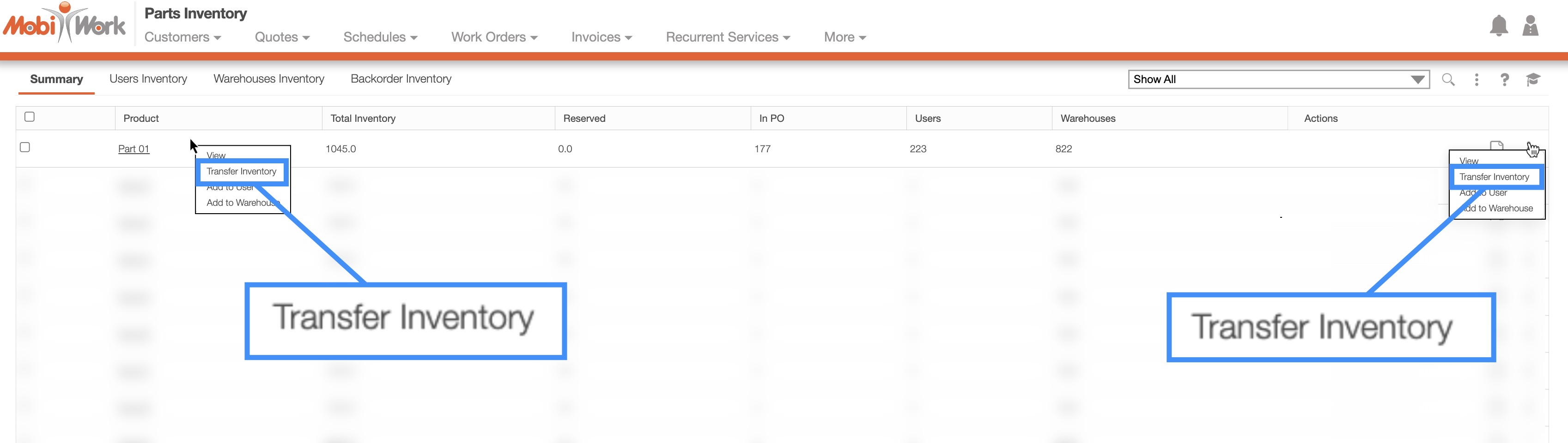 You will also be able to transfer inventory to a warehouse or user from the Inventory "Summary," "Users Inventory," and "Warehouses Inventory" tabs.