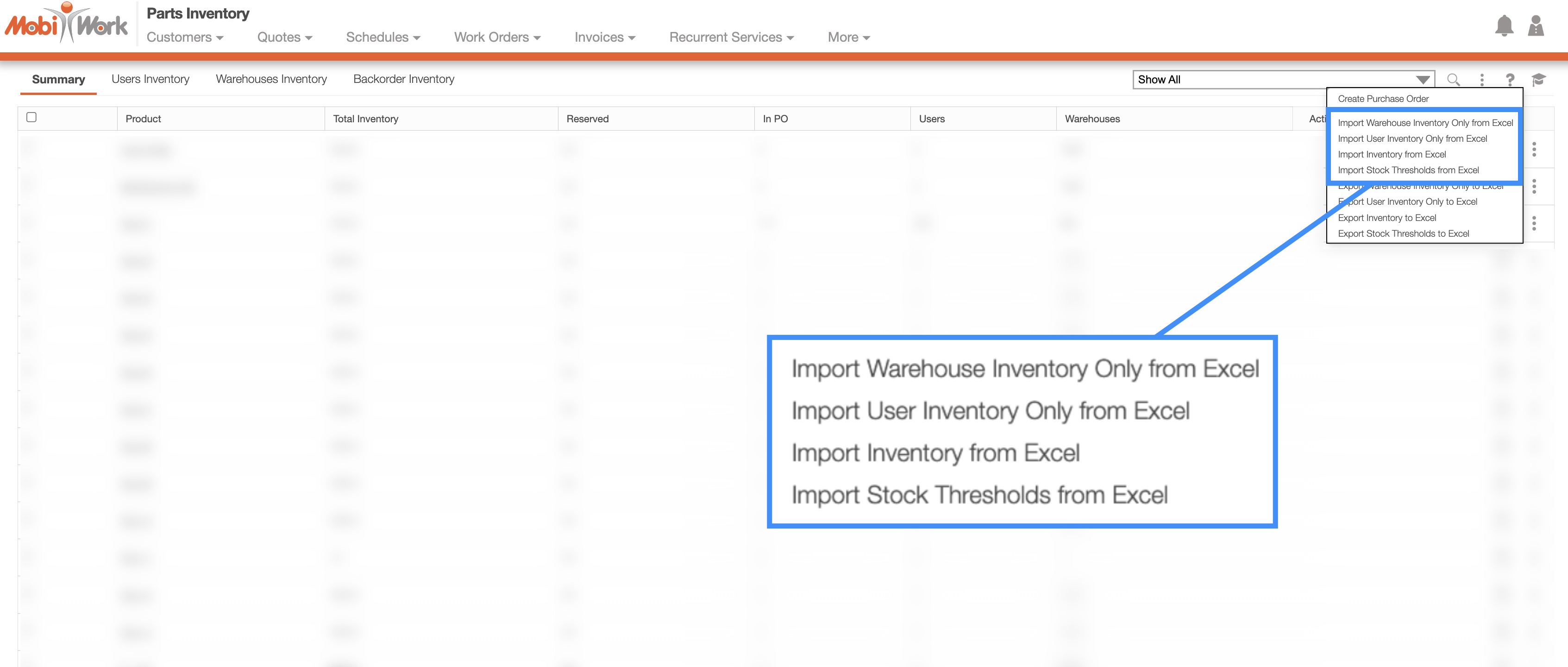 Import Inventory From Excel- This action imports inventory data for both your users and warehouses.