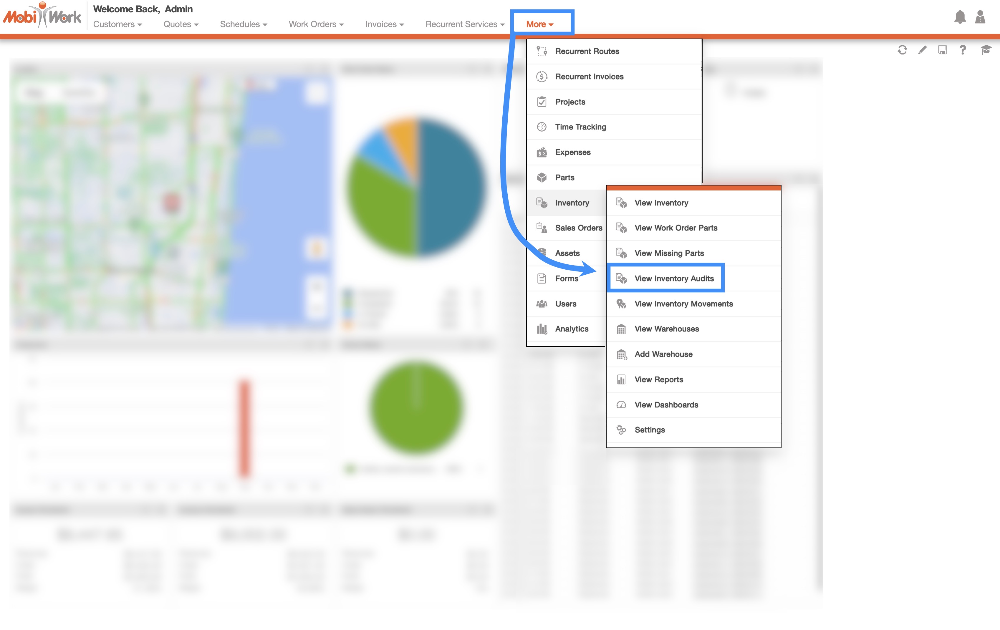 You can access the Inventory Audits page by hovering over the Inventory feature from your MobiWork menu and clicking on the "View Inventory Audits" option when it appears: