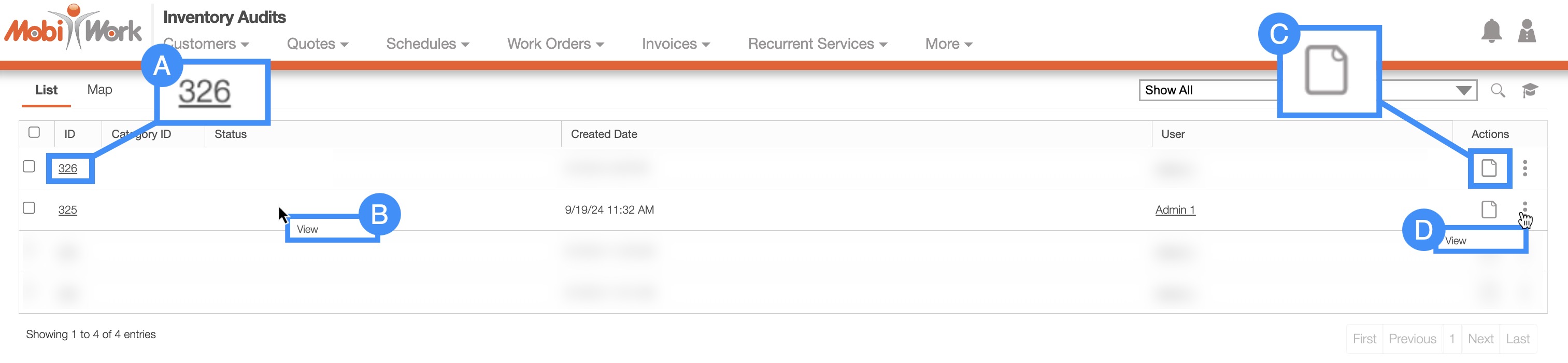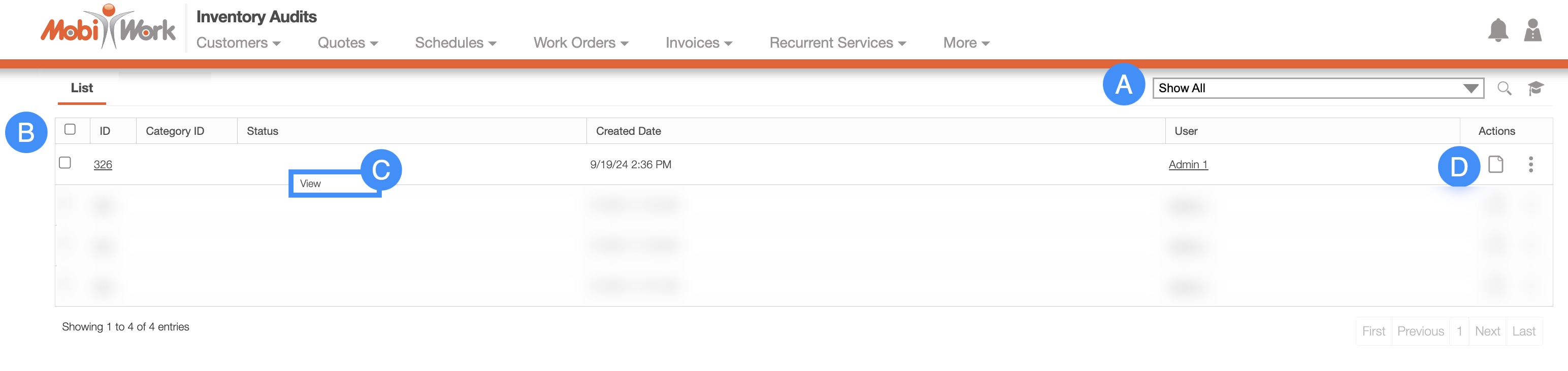 The Inventory Audits List columns will display the corresponding data related to the specified audit, including the ID, category ID, the status, the created date, and user.