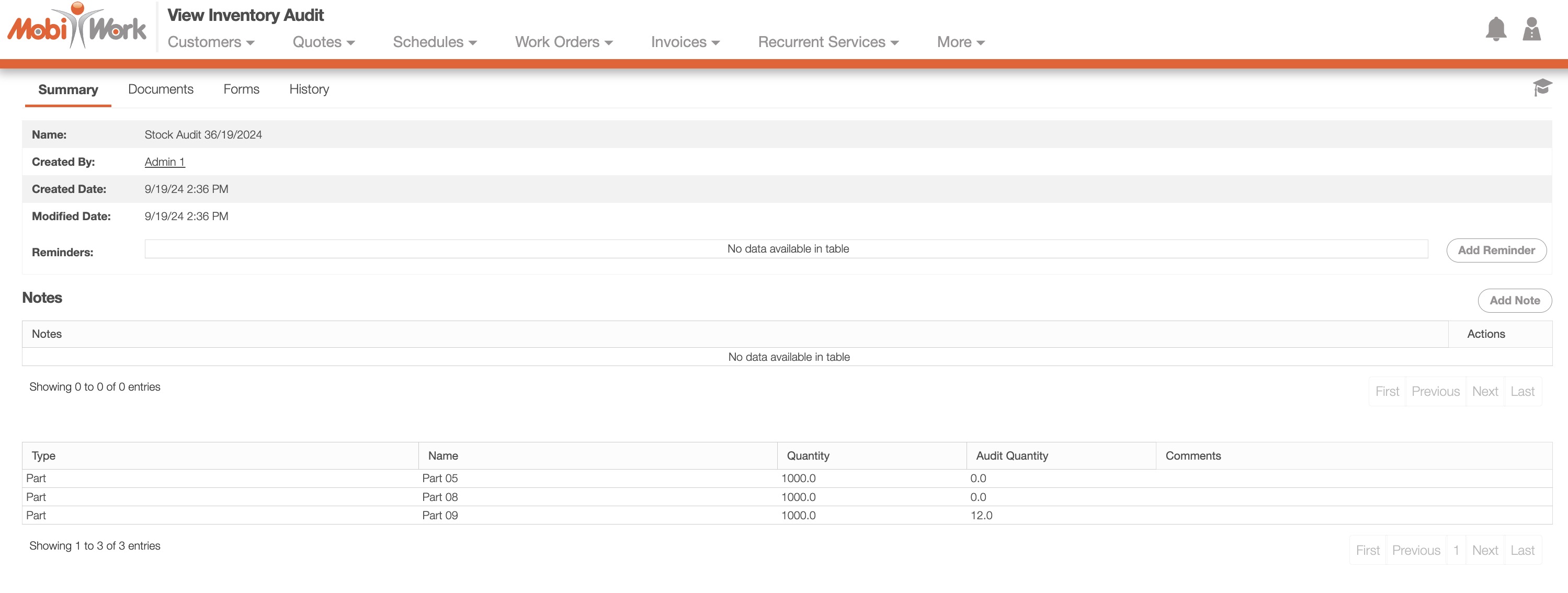 The list of all the parts or products on the audit will also be displayed; you will be able to add additional parts or products through your MobiWork mobile app.