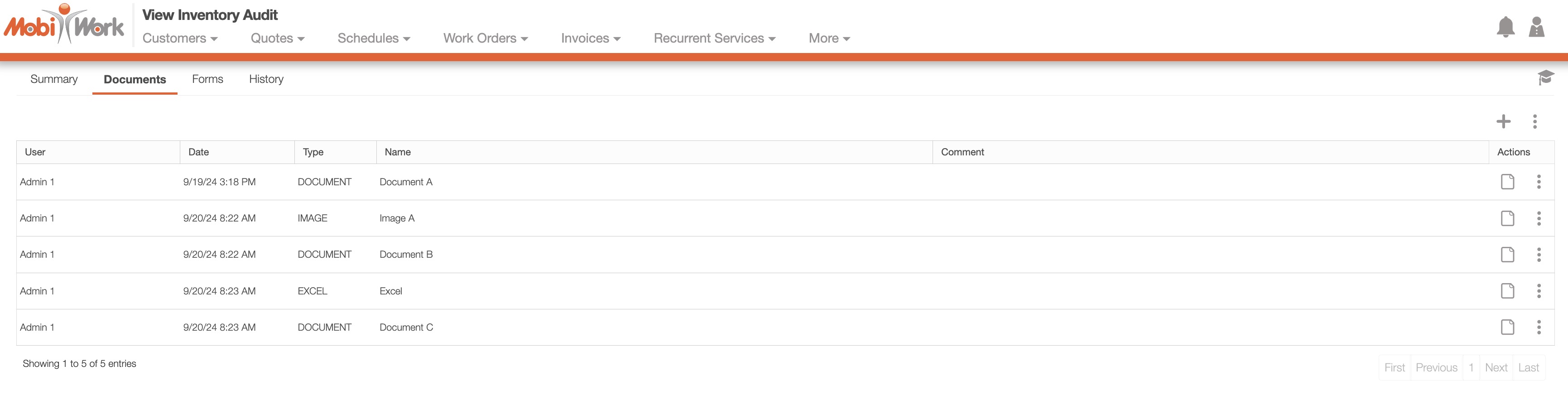 The "Documents" tab will allow you to store audit-specific documentation (e.g., contracts, photos, etc.) for future use. This tab will also list the type of document file, the date it was uploaded, the user who uploaded it, and more.