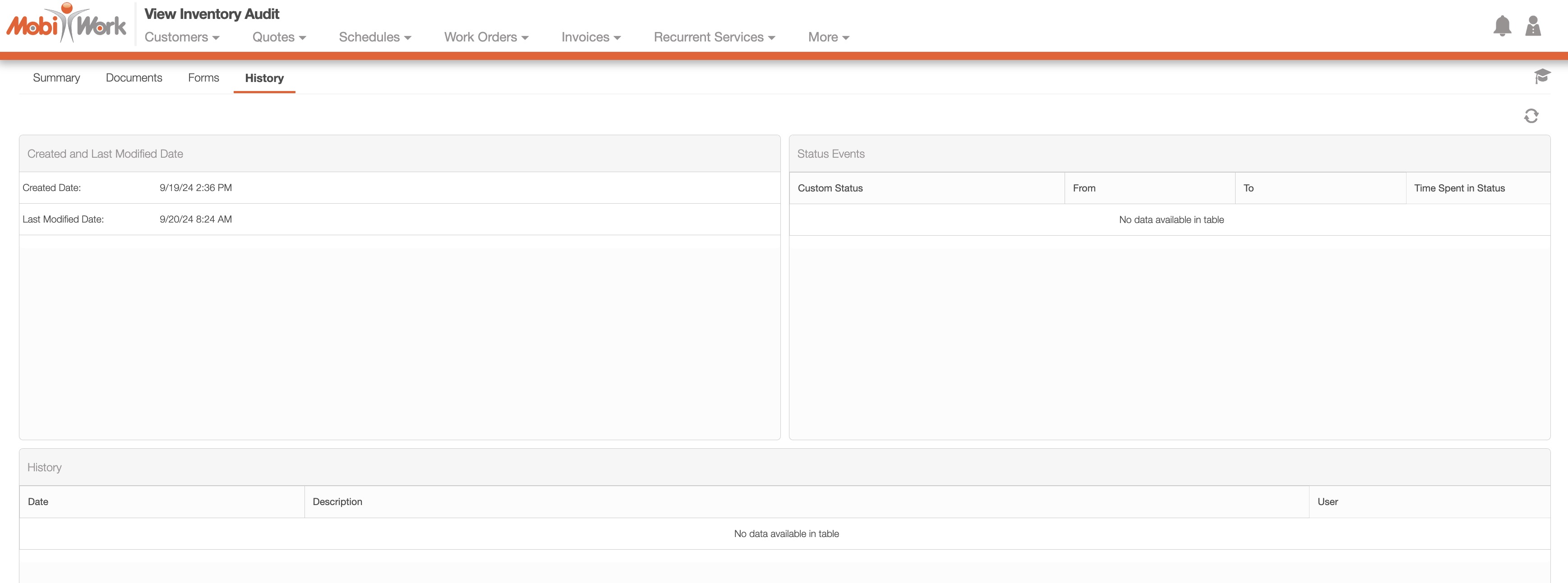 The View Inventory Audit pop-up window has four different tabs that will allow you to access the different aspect of the audit; these tabs are listed as "Summary," "Documents," "Forms," and "History." The following subsections will go into more detail regarding the different tabs found on the View Inventory Audit pop-up window.