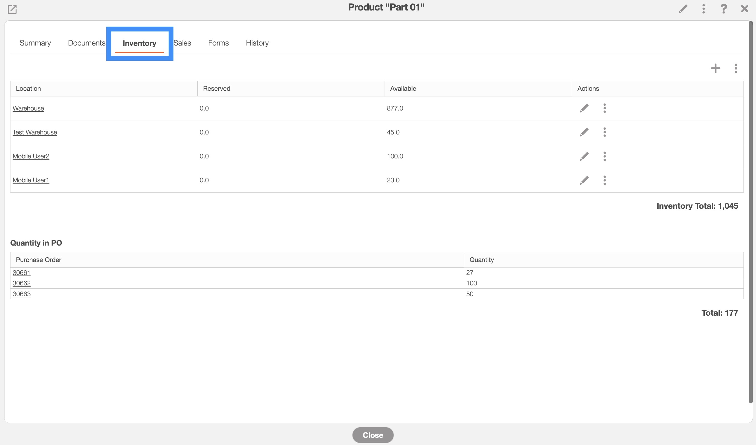 To edit the part or products inventory levels, first access the "Inventory" tab in the View Part pop-up window: