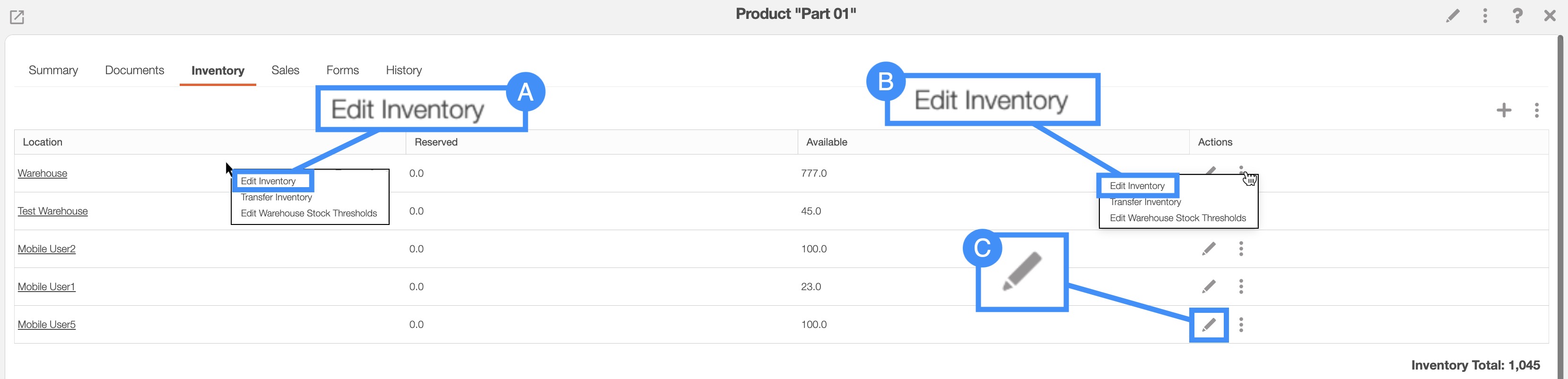 Once you are on the "Inventory" tab on the View Part pop-up window, there are three different ways that you can edit the inventory stock levels of the selected part or product: