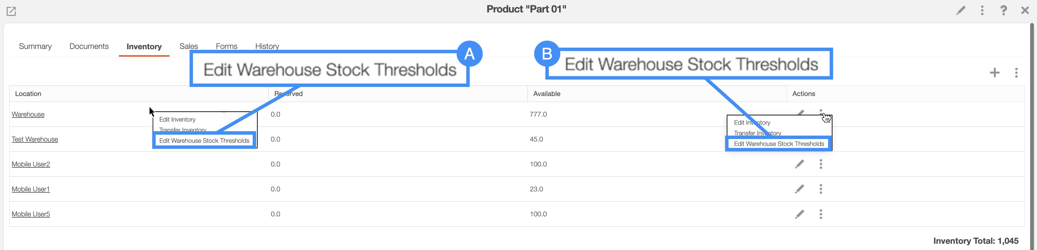 Clicking on the Individual Actions button and selecting the "Edit Warehouse Stock Thresholds" option from the drop-down.