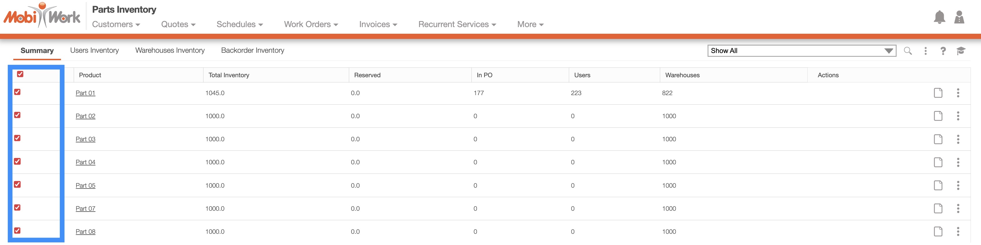 To export your inventory levels to an Excel file from the Inventory feature page, select the parts that you would like to export: