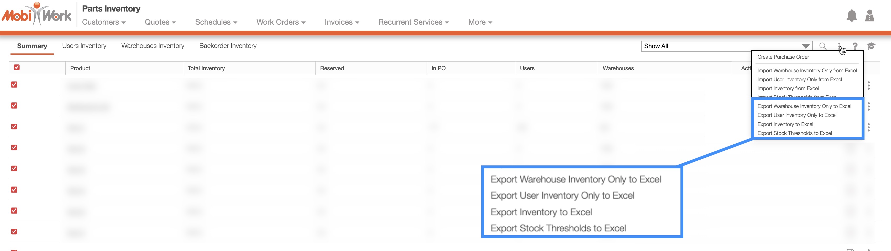 Export Inventory to Excel- This action exports inventory data for both your users and warehouses.