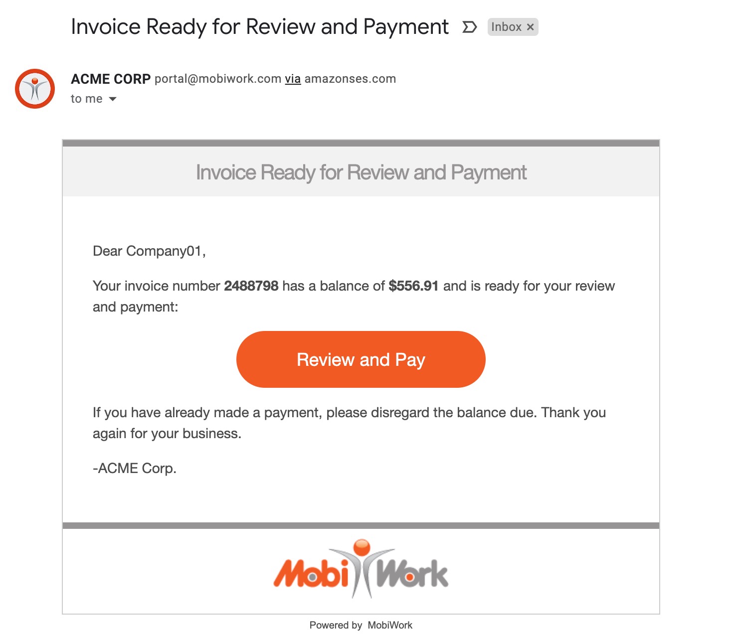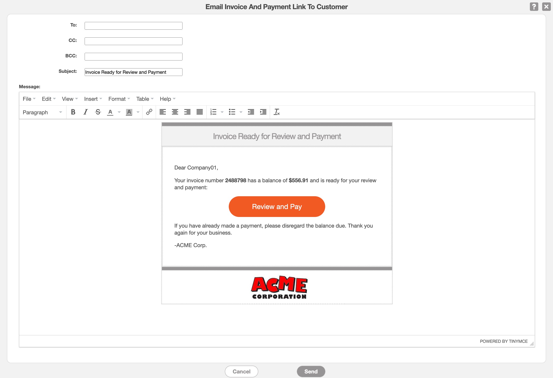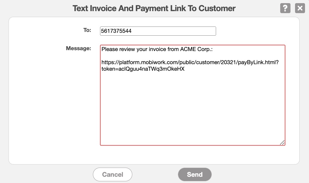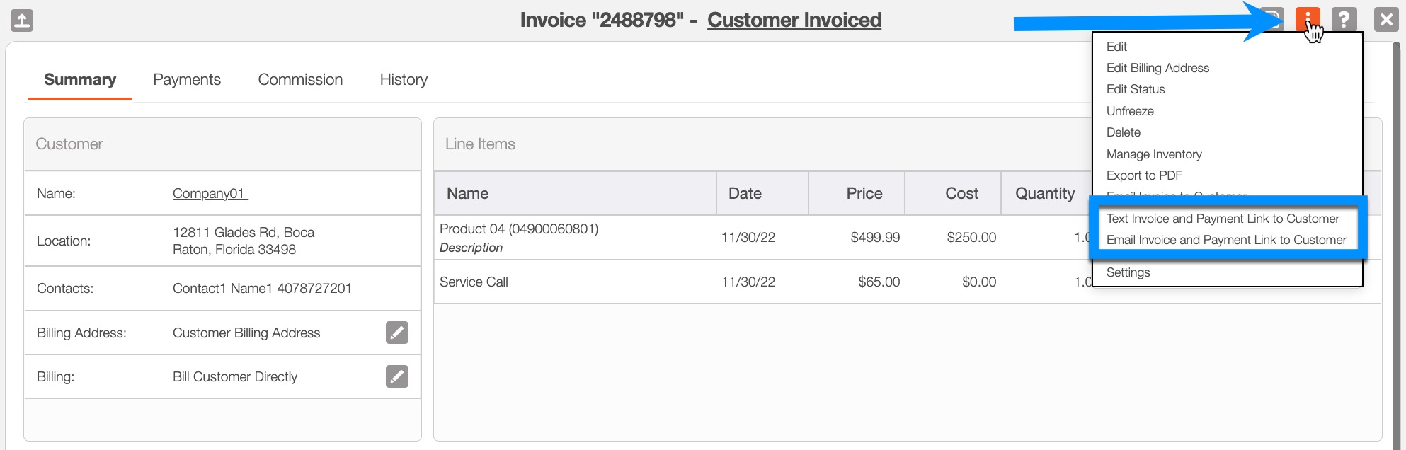 This guide will illustrate sending an email or text message through the View Invoice pop-up window.