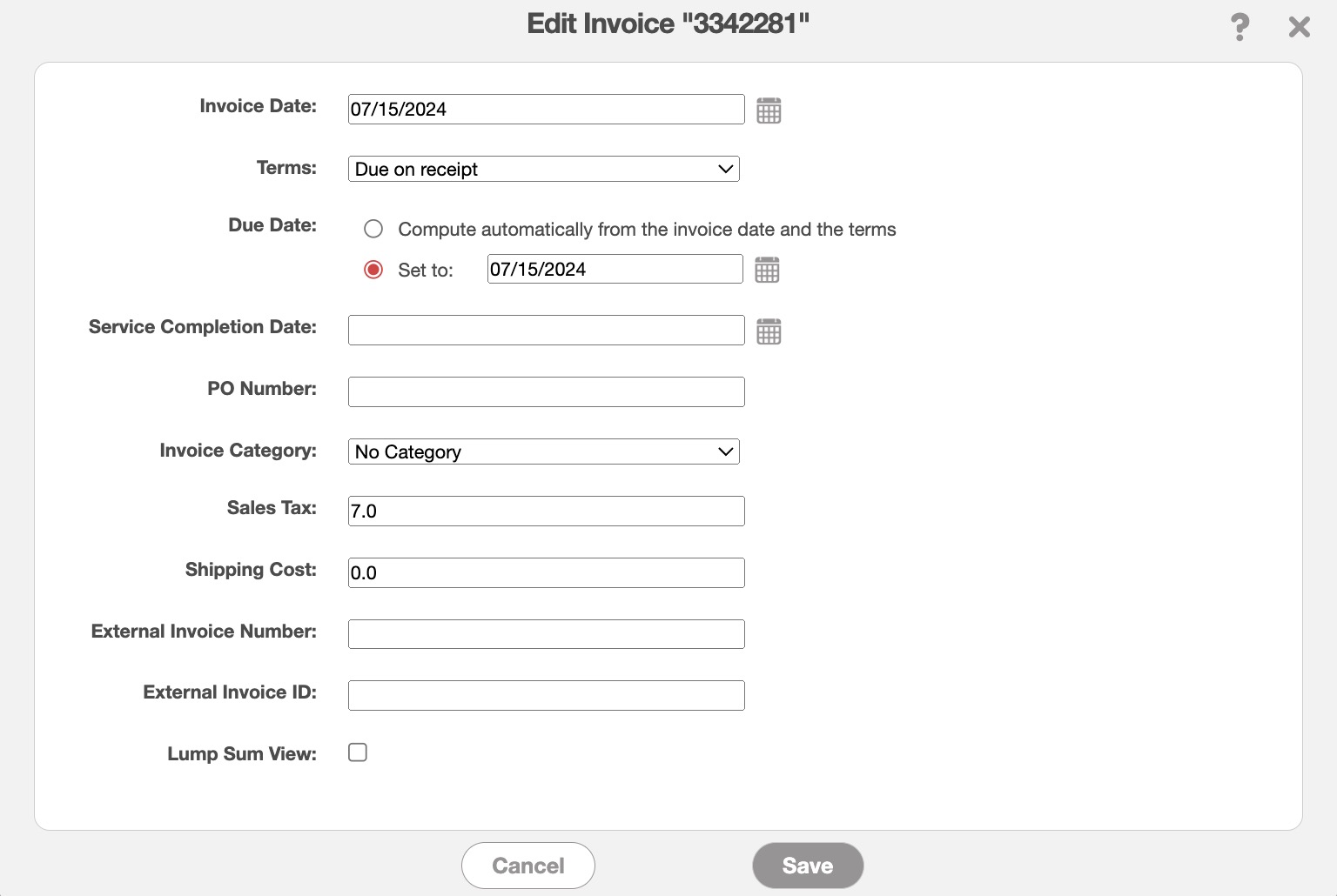 If you would like to only edit the billing details or contact of an invoice, you will be able to do so through the View Invoice pop-up window. To see how to access this pop-up window, please see the View an Invoice page.