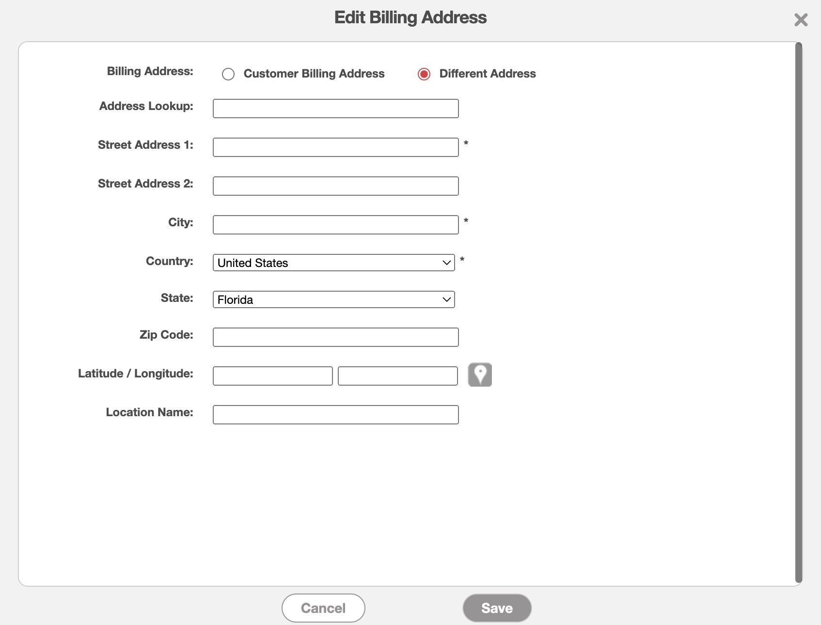 - The Edit Billing Address pop-up window will then appear; you can choose to use the "Customer Billing Address" or a "Different Address:"