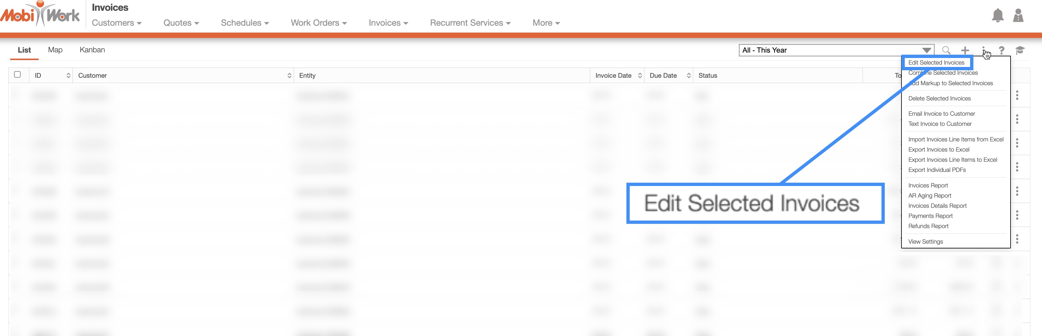 MobiWork allows you to edit multiple invoices at once, thus saving you time from having to update invoices one at a time. You can update multiple invoices in two ways: through the More Actions button or through Excel.