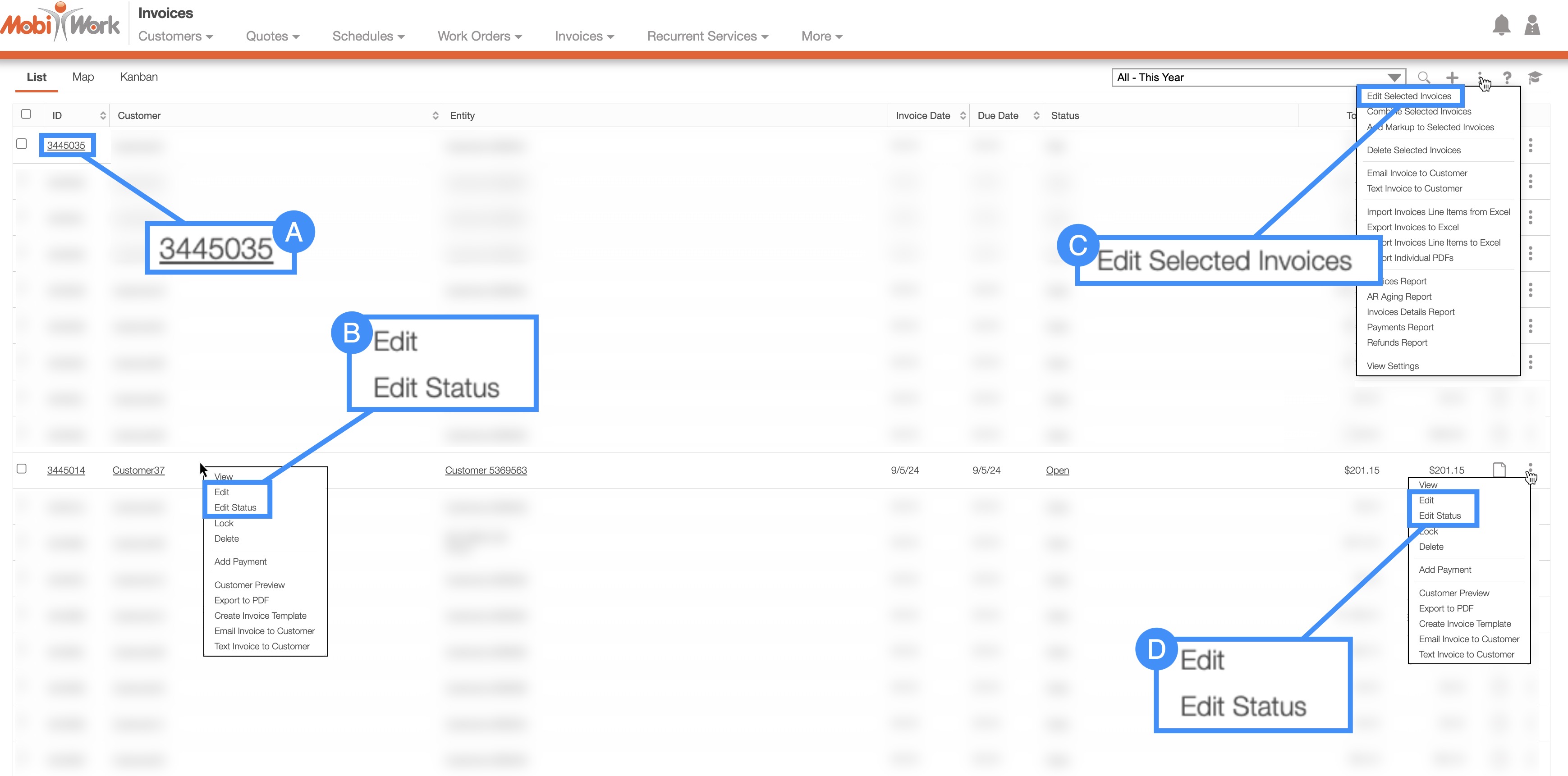 Instead of editing the entire invoice, MobiWork also gives you the option to update only the status. The section, How to Access the Page, will illustrate how to navigate to access this action.