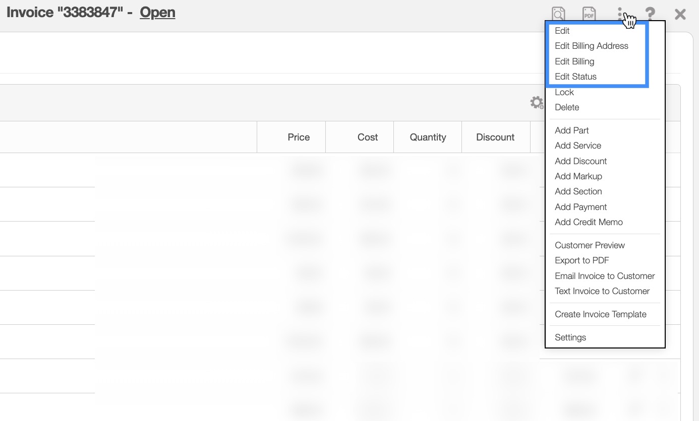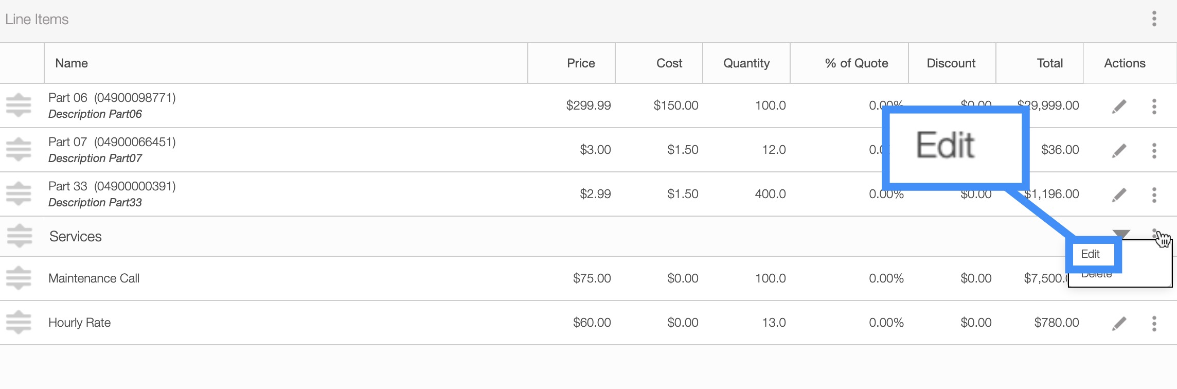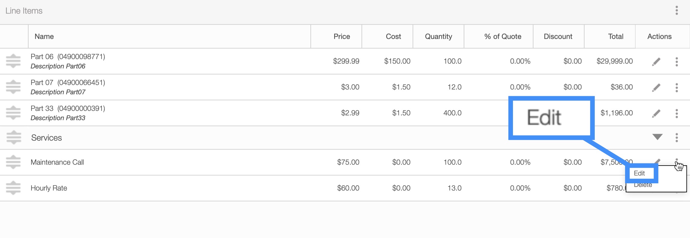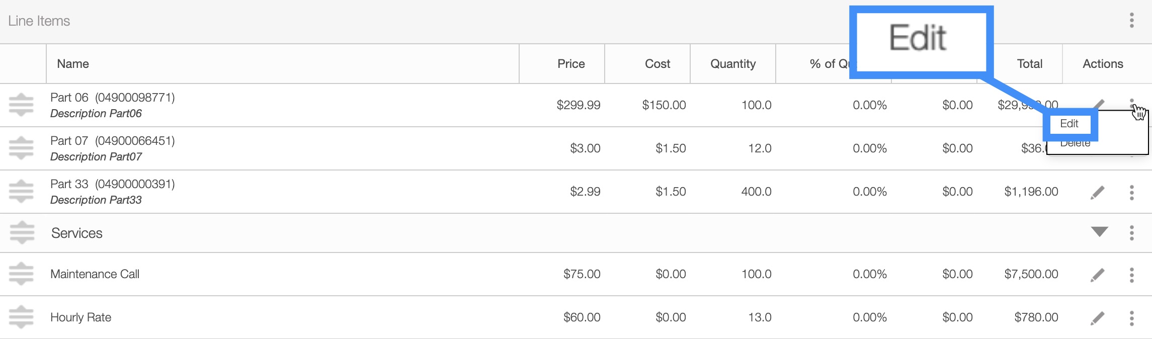 You will be able to edit the parts, services, and sections listed in the invoice's line items. The following subsections will illustrate how to edit these different line item entries.