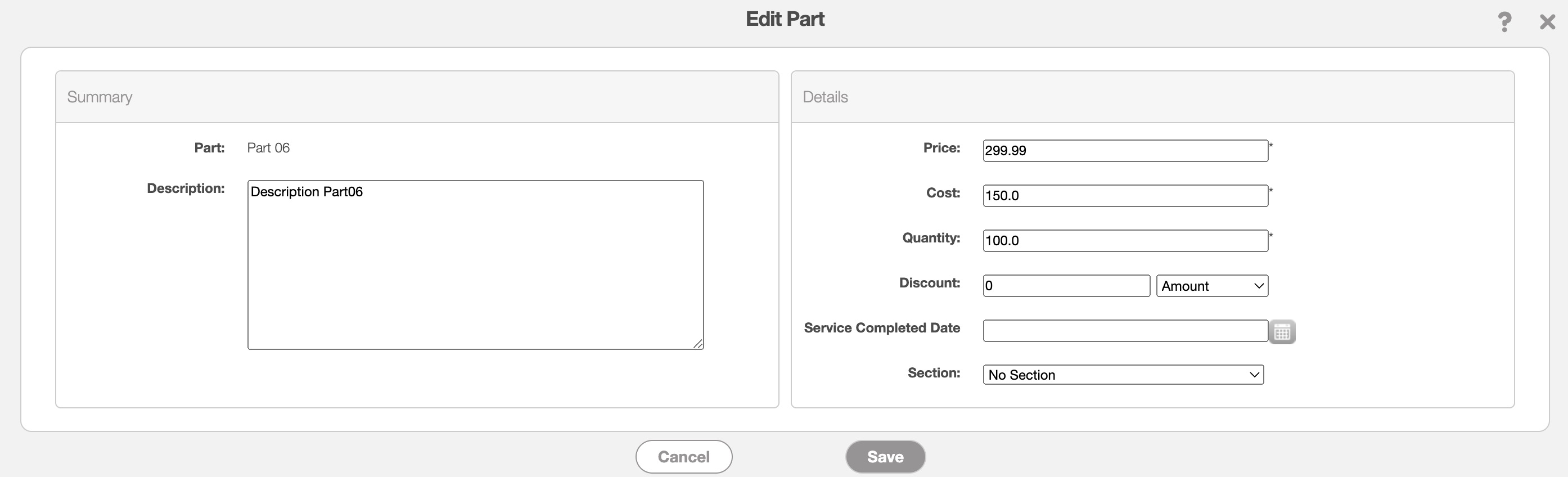 Price and Cost- These fields will be automatically filled based on the saved data you have in your parts catalog; however, you can directly edit the price and cost. For more information about your parts catalog, please see the Parts List (Catalog) page.