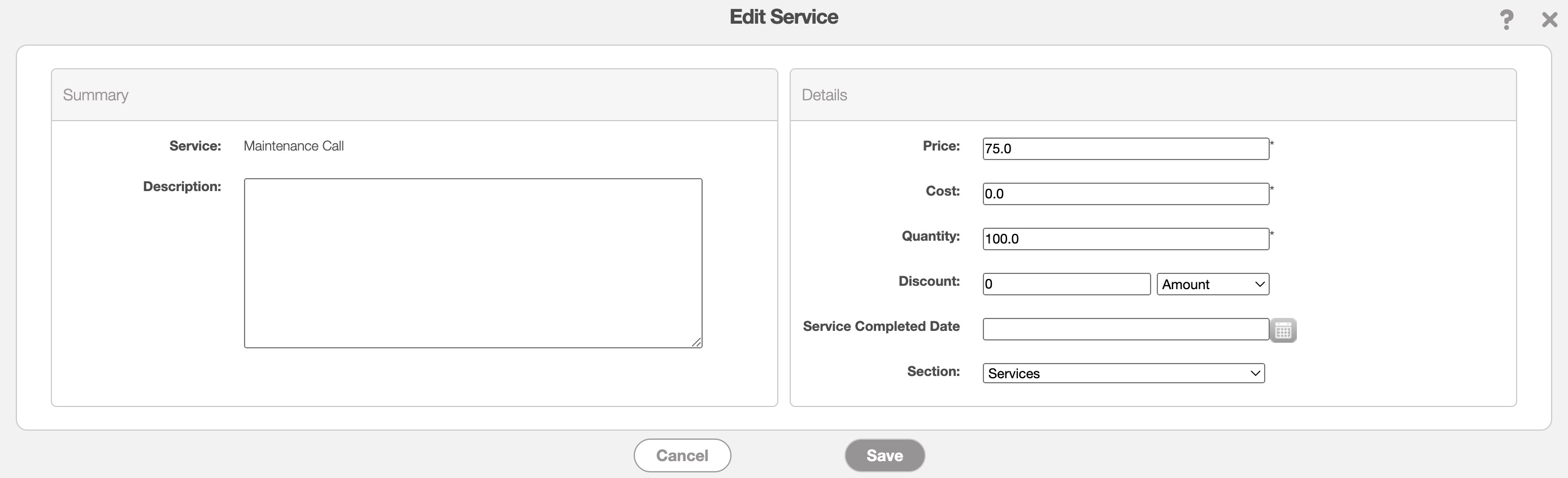 Price and Cost- These fields will be automatically filled based on the saved data you have in your services catalog; however, you can directly edit the price and cost. For more information about your services catalog, please see the Services Catalog (list) page.