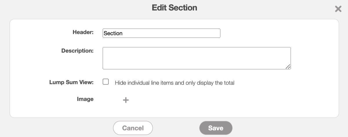 Lump Sum View- You can choose to uncheck or check the "Lump Sum View" option. By clicking on the lump sum view for the Edit Section pop-up window, you will be able to hide the individual line items for the items listed in the specified section. This option is different from the "Lump Sum View" checkbox in the Add Invoice pop-up window and the Edit Invoice pop-up window; this lump sum view will apply to the entire invoice.