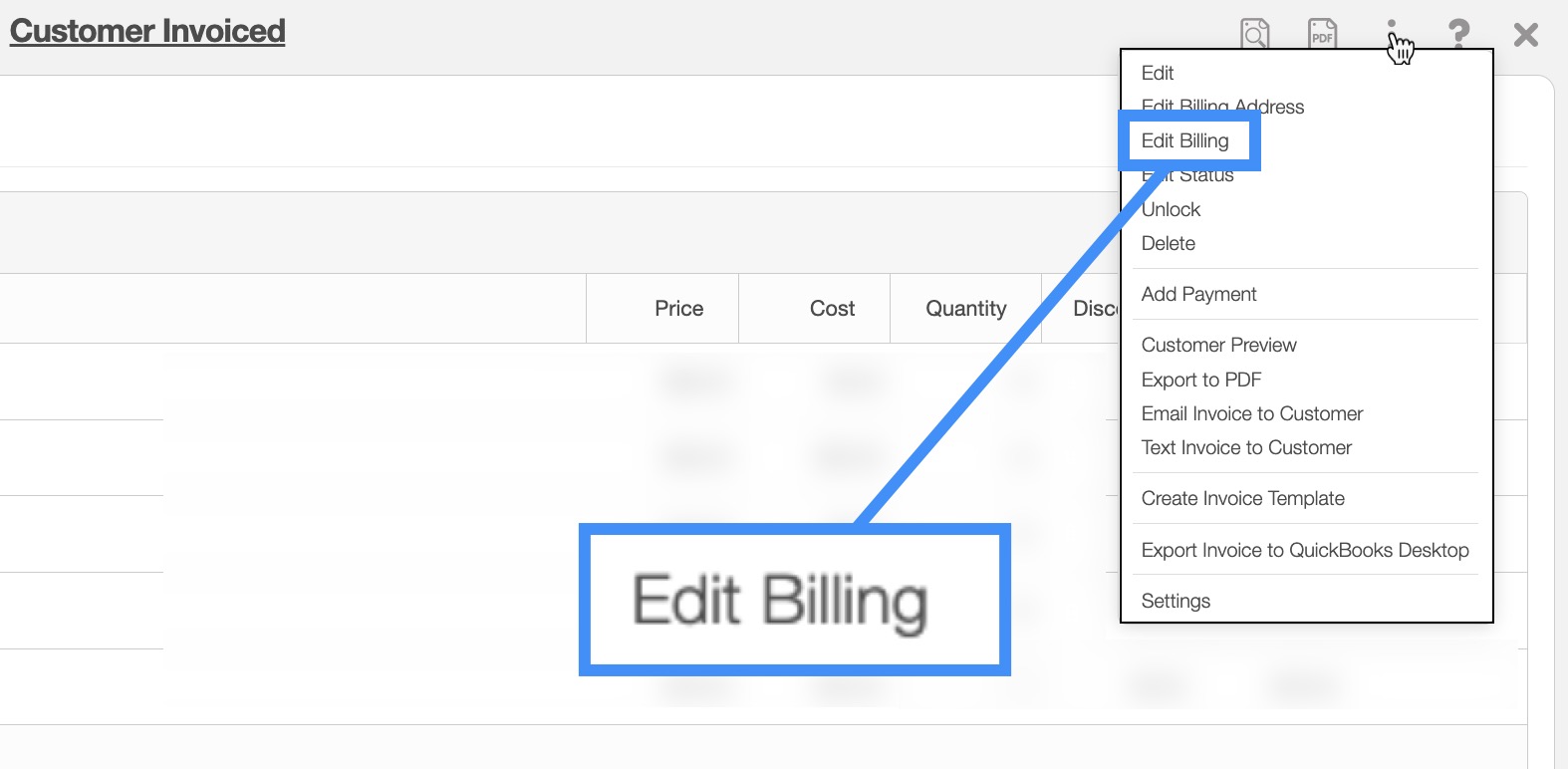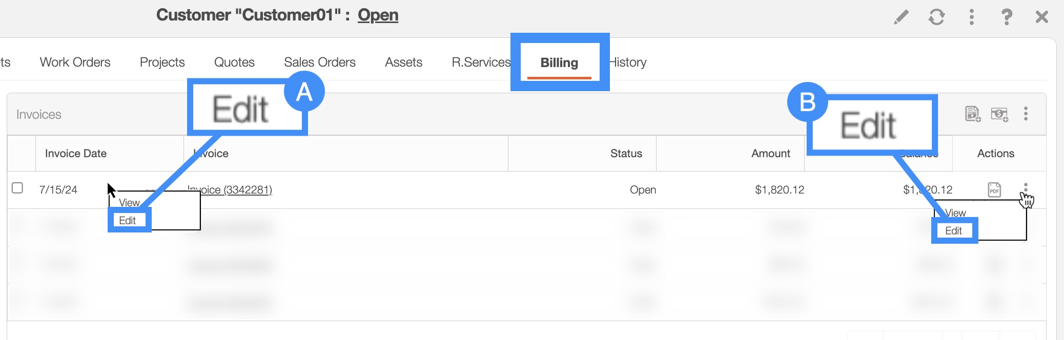 - Once you are on the "Billing" tab for the View Customer pop-up window there are two different ways you can edit an invoice: