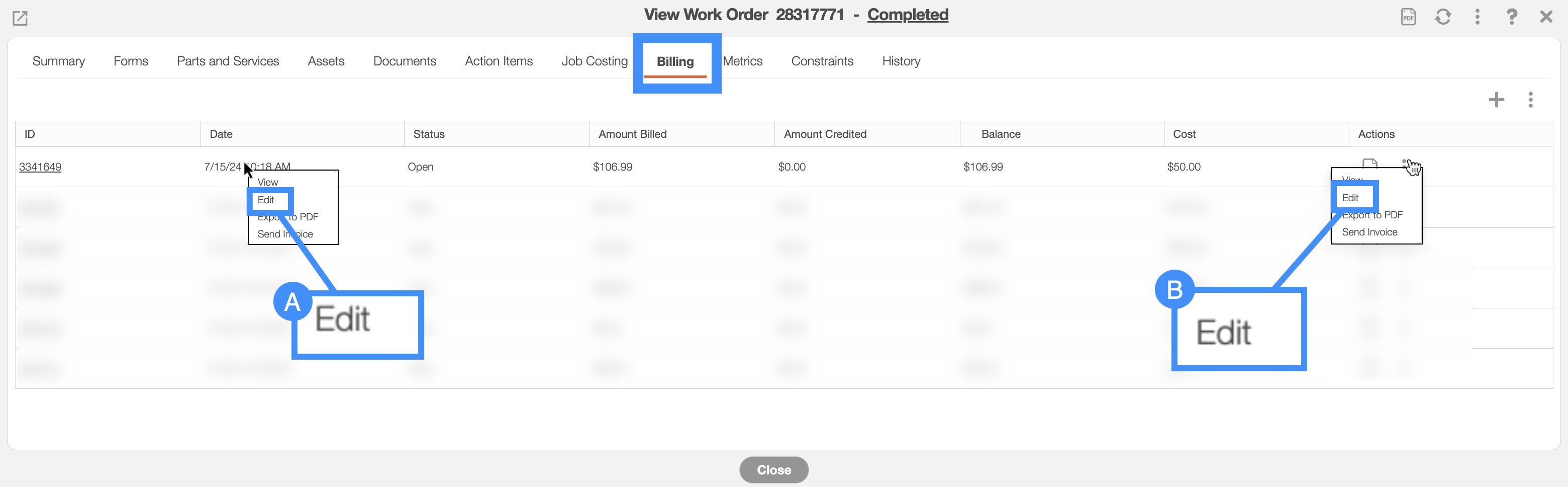 - Once you are on the "Billing" tab for the View Work Order pop-up window there are two different ways you can edit an invoice: