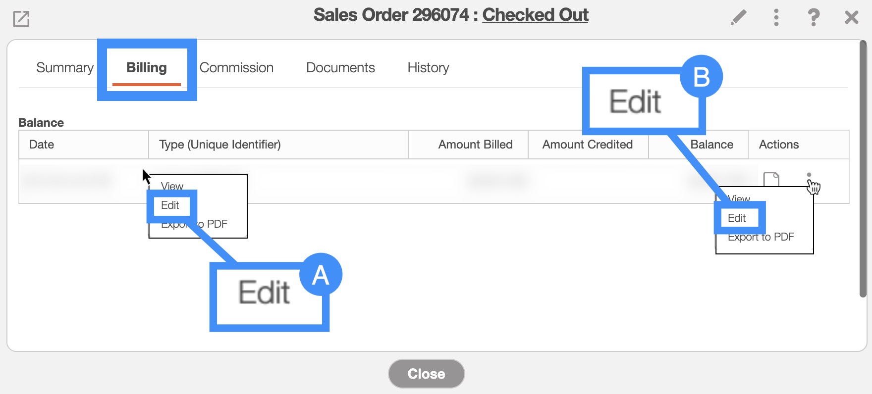 - Once you are on the "Billing" tab for the View Sales Order pop-up window there are two different ways you can edit an invoice: