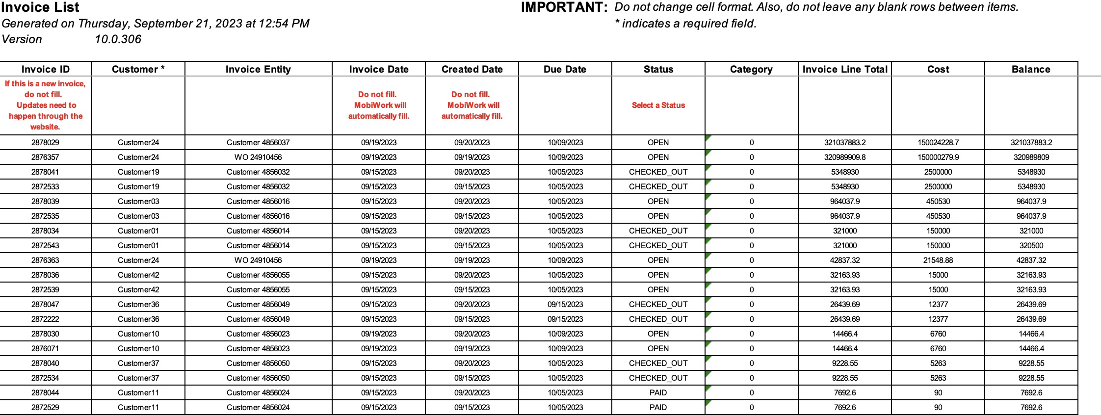 Once you are done updating your invoices, you can import the Excel file back into MobiWork. For more information on how to import invoices, please see the Import Invoices page.