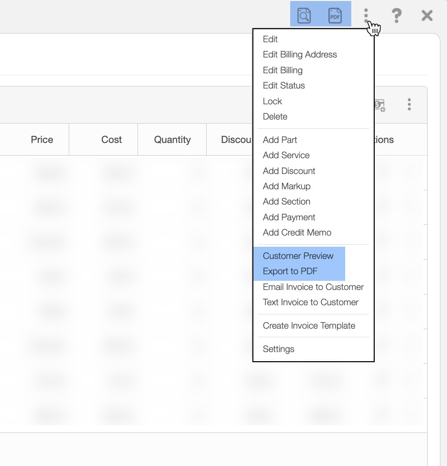 - From this window you can access the "Export to PDF" or "Customer Preview" option from the Individual Actions drop-down; you can also click on the PDF button to access the PDF directly or select the Magnifying Glass icon to see the customer preview of the invoice: